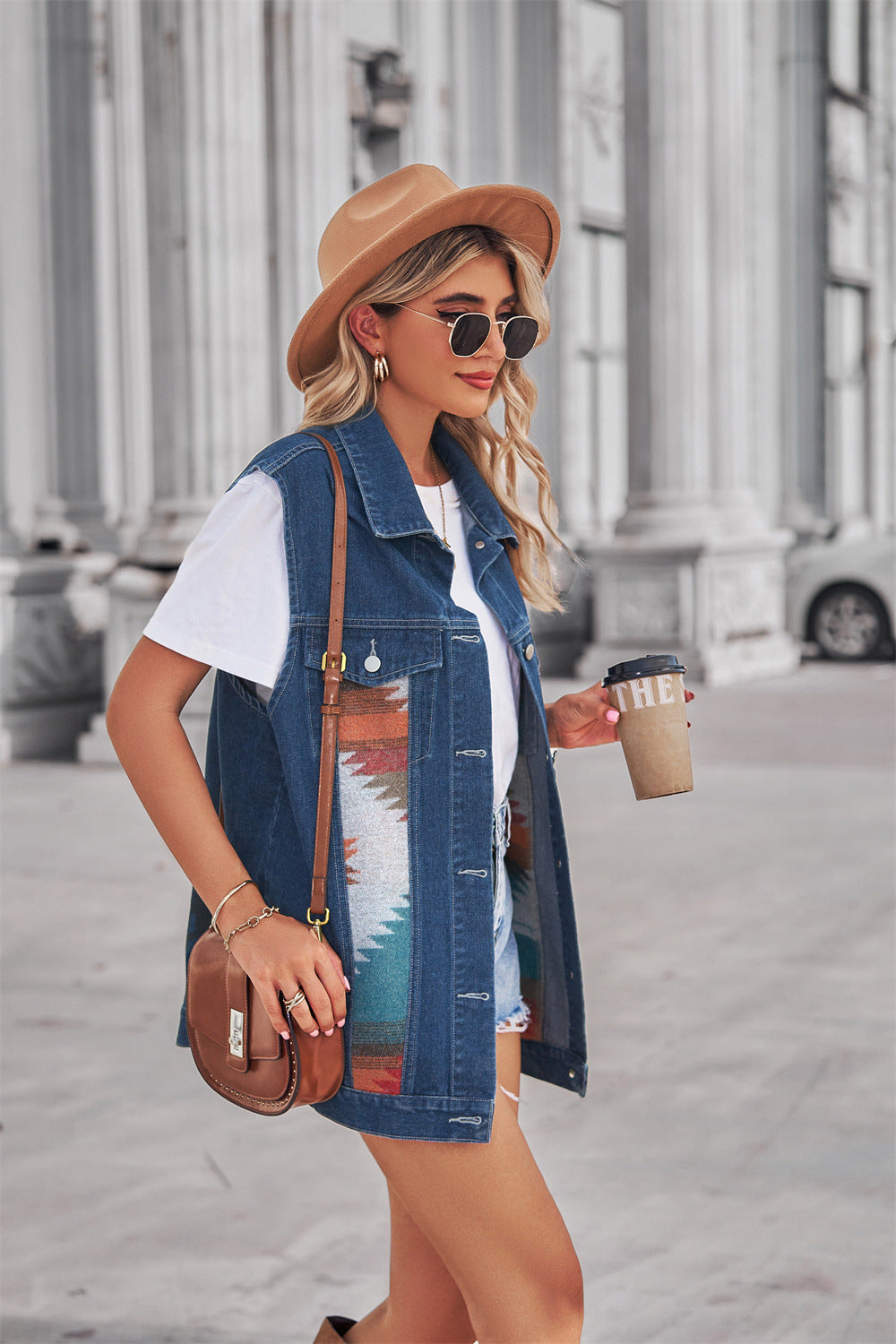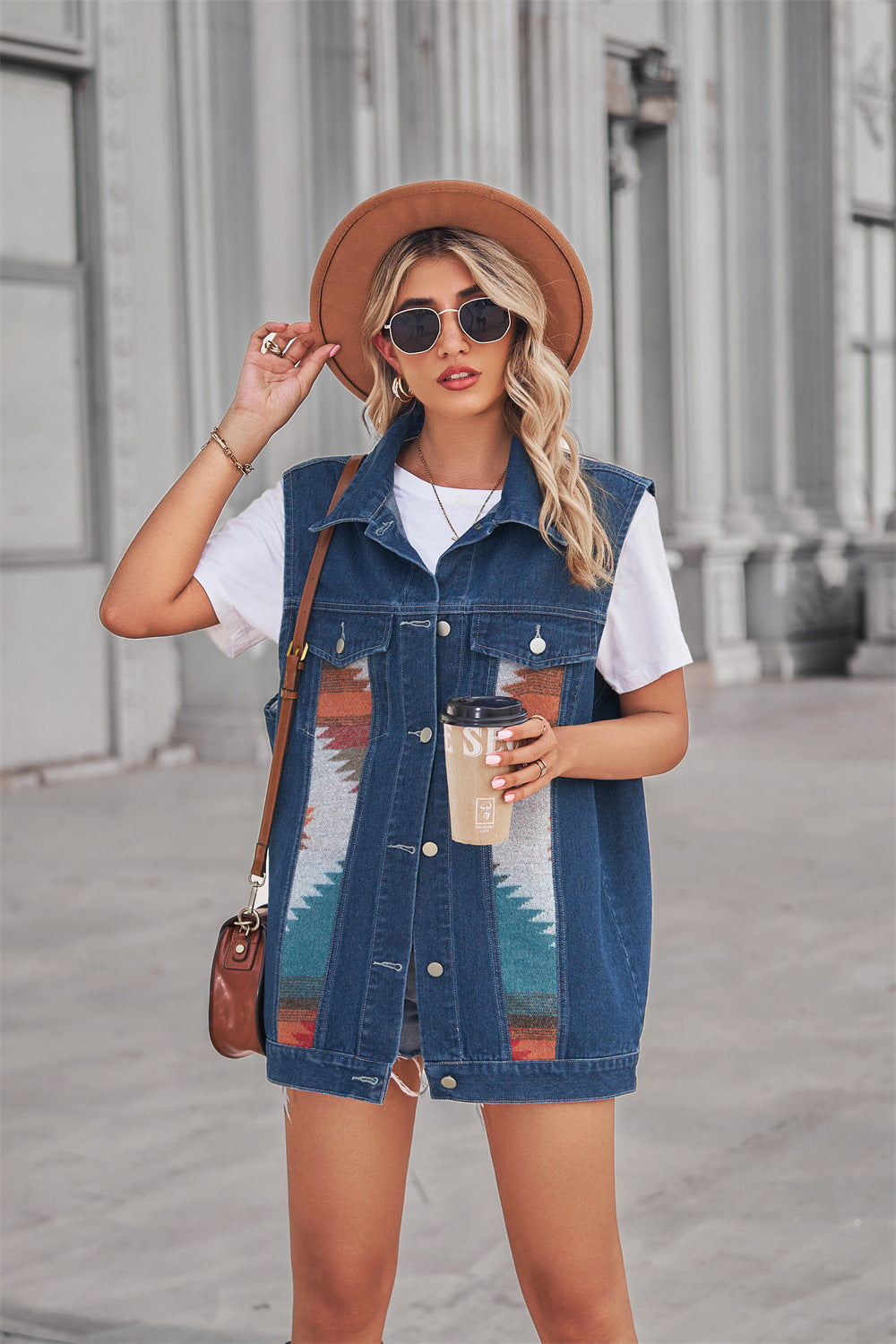 Aztec Pattern Blue Denim Vest Women’s Loose Fit