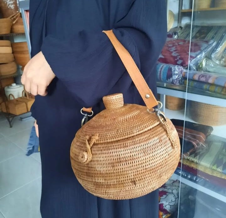 Embrace the natural elegance of Bali with our rattan pot bag, meticulously handcrafted to offer a unique blend of tradition and versatility.