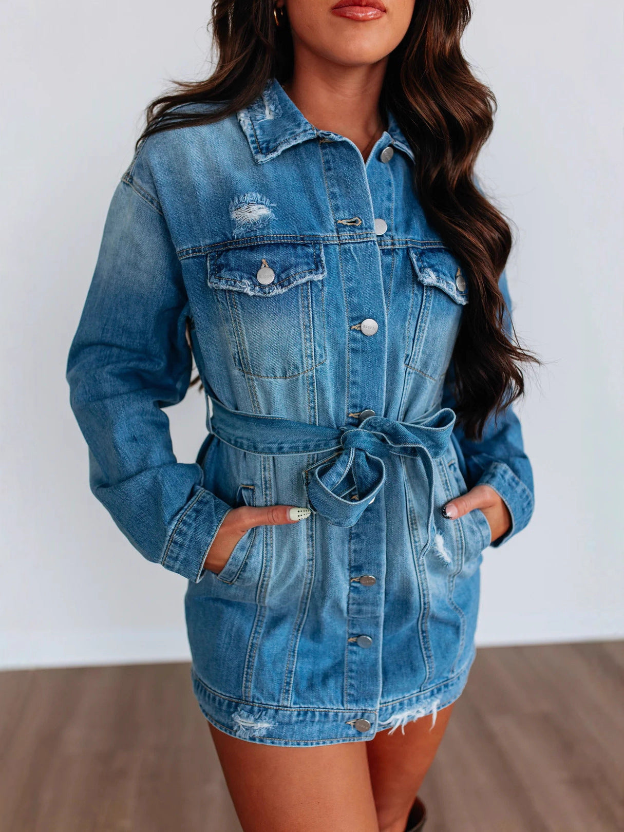 This belted distressed denim jacket dress blends retro street style with a modern fit. Designed as a denim shirt dress with belt, it features a faded wash, distressed detailing, and button-front structure. The belted denim dress shape defines the waist while maintaining comfort, making it a reliable option for everyday styling across seasons.
