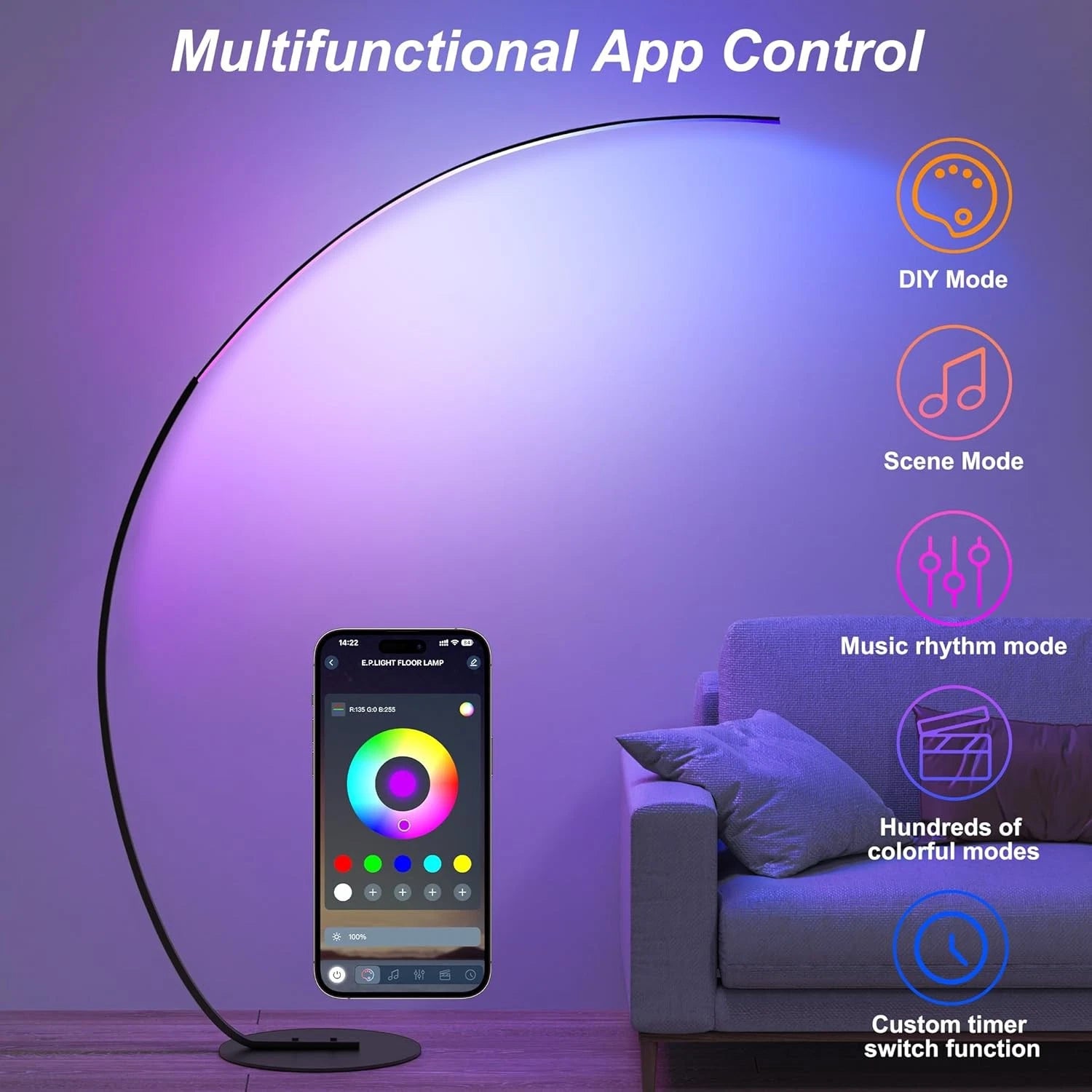 - Floor lamp arc with dual light sources – provides both RGB ambiance and practical LED task lighting