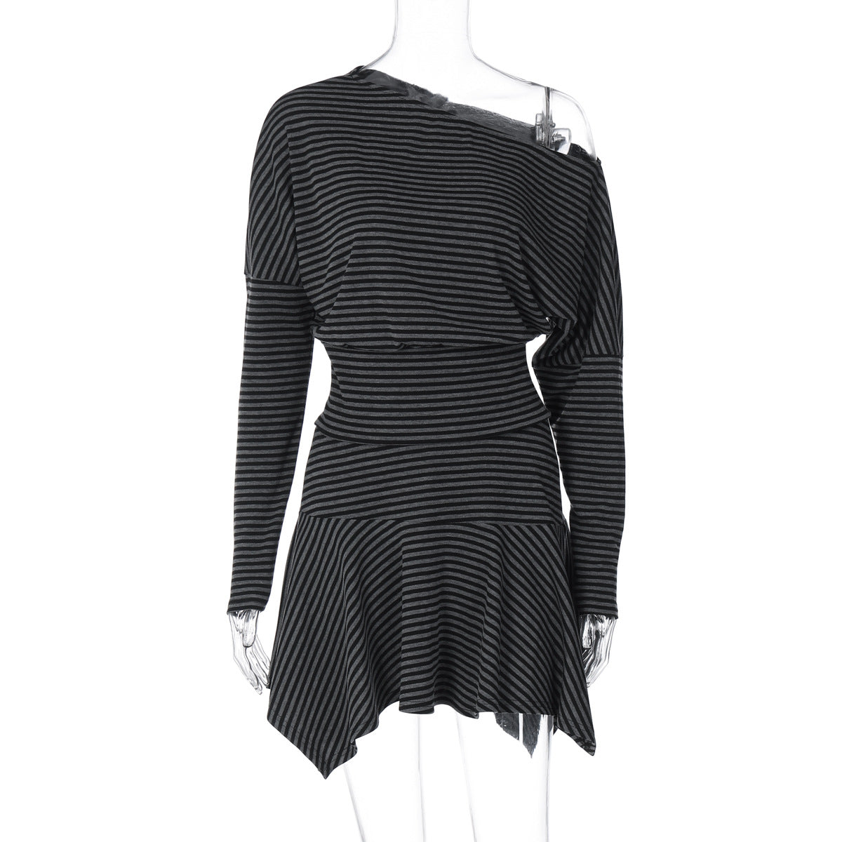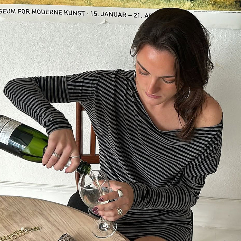 A sleek fusion of modern street fashion and flattering contour, this black and gray striped off shoulder top and asymmetrical skirt set defines effortless confidence. Designed as a slim fit asymmetrical hem long sleeve t-shirt paired with a soft-flow skirt, it brings comfort and visual symmetry in one look. The off shoulder top draws focus to the neckline while maintaining casual allure, making it ideal for city walks, brunches, and travel wardrobes. Crafted with stretch-knit fabric for breathable structure, this women’s streetwear top ensures perfect balance between form and freedom. Ideal for multi-season layering and fast-paced urban style.
