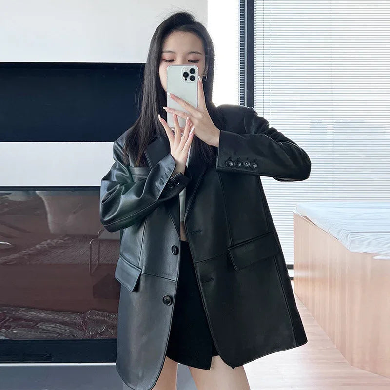 • Single-breasted front with structured notch lapel and clean button closure for a sharp leather blazer for women look