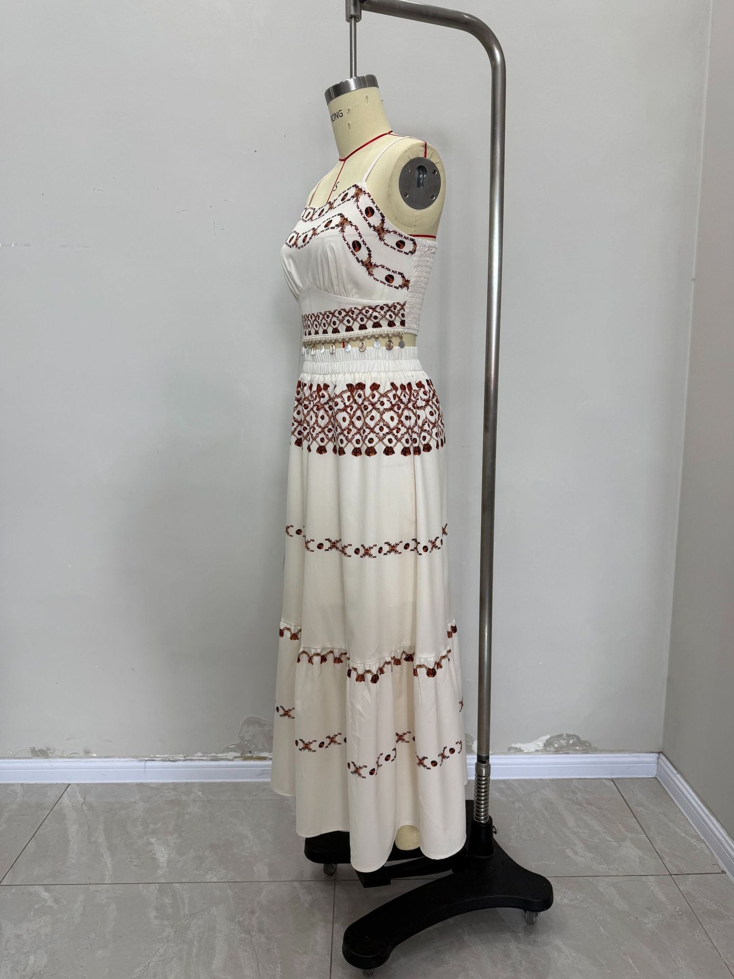- Detailed tassel embroidery across bust, waist, and skirt panels adds authentic bohemian character