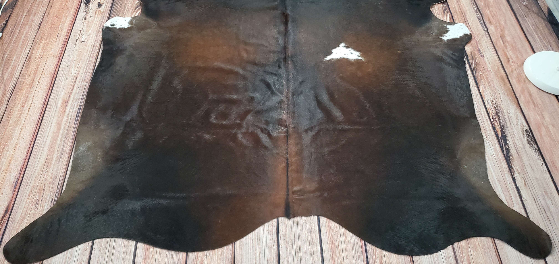 All my dark brown cowhide rugs are premium Brazilian, beautiful shine and perfect thickness. We handpicked each for its exotic patterns and markings. Like all other cowhides USA this one is also unique and one of its kind, its mostly brown with beautiful shiny white in the background.