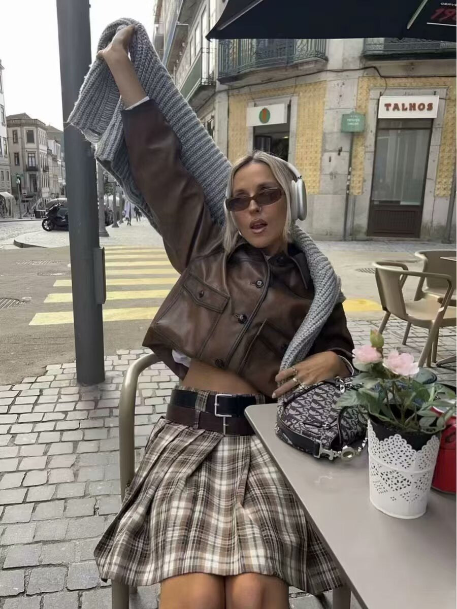 This brown faux leather bomber jacket for women is a statement outerwear essential designed with a modern cropped cut and clean, structured lines. The faux leather jacket women silhouette blends a soft matte PU texture with visible seam shading for a subtle vintage look. Perfect for transitional seasons, this cropped faux leather jacket women pairs beautifully with jeans, trousers, or skirts, offering endless layering potential. The wide sleeves, button-down front, and oversized pockets emphasize a confident, American-inspired streetwear aesthetic. Ideal for those seeking a refined yet bold wardrobe piece, this women faux leather jacket transitions easily from day to night wear.