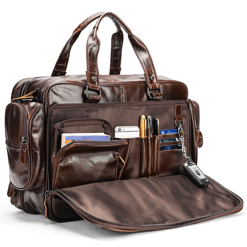 • This leather duffle bag men model features multiple compartments for A4 documents, clothes, umbrella, pens, and wallet
