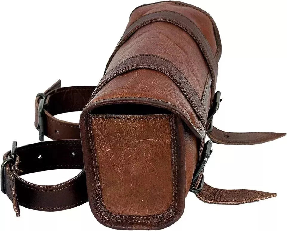 This leather motorcycle bag is a compact solution for riders who need reliable storage on the go. Designed for cruisers, choppers, and café racers, this saddle pouch can be mounted directly onto the frame, fork, or under the seat. Its cylindrical shape is perfect for storing tools, gloves, documents, or other everyday items without adding bulk. With genuine leather material and a brown finish, the saddle bag fits seamlessly with any vintage or classic-style setup.