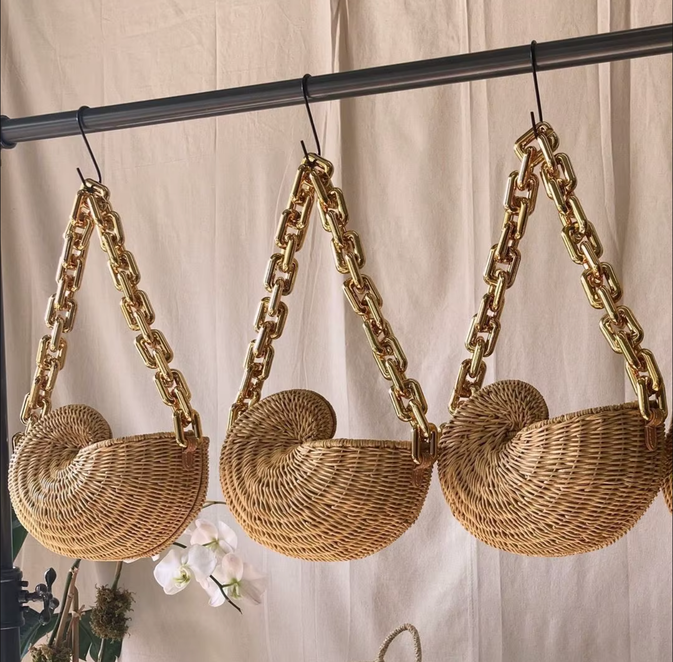 Turn heads this season with a shell-shaped woven straw conch bag designed for women who want a natural, beach-inspired style. Featuring a bold acrylic chain shoulder strap, this straw purse for summer blends lightweight comfort with statement detail. Perfect as a straw bag shoulder bag or woven crossbody bag, it pairs seamlessly with dresses, resort wear, and vacation looks. Unlike a standard beach tote, this straw handbag for women stands out with its unique design while keeping your phone, wallet, and essentials secure. An ideal choice for summer straw bags and vacation accessories, this woven purse combines fashion and function for effortless seasonal style.