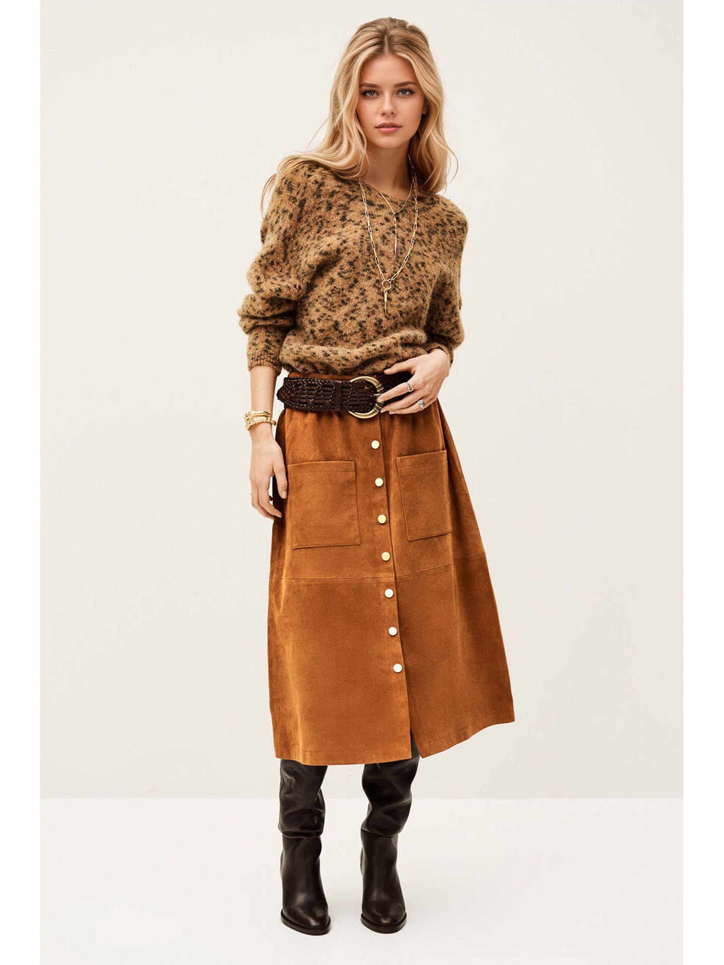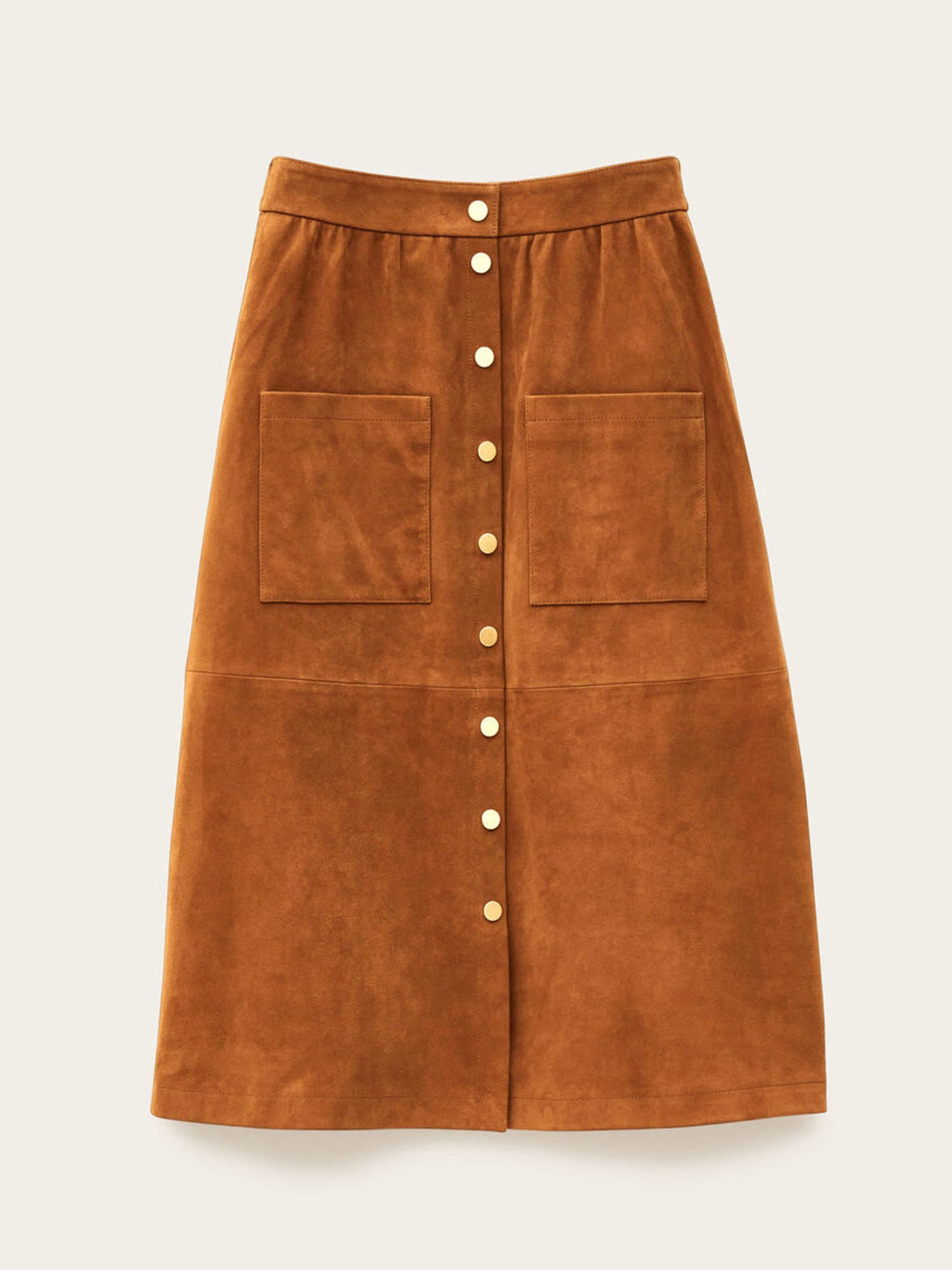 - Brown corduroy skirt pairs seamlessly with neutral or bold accessories