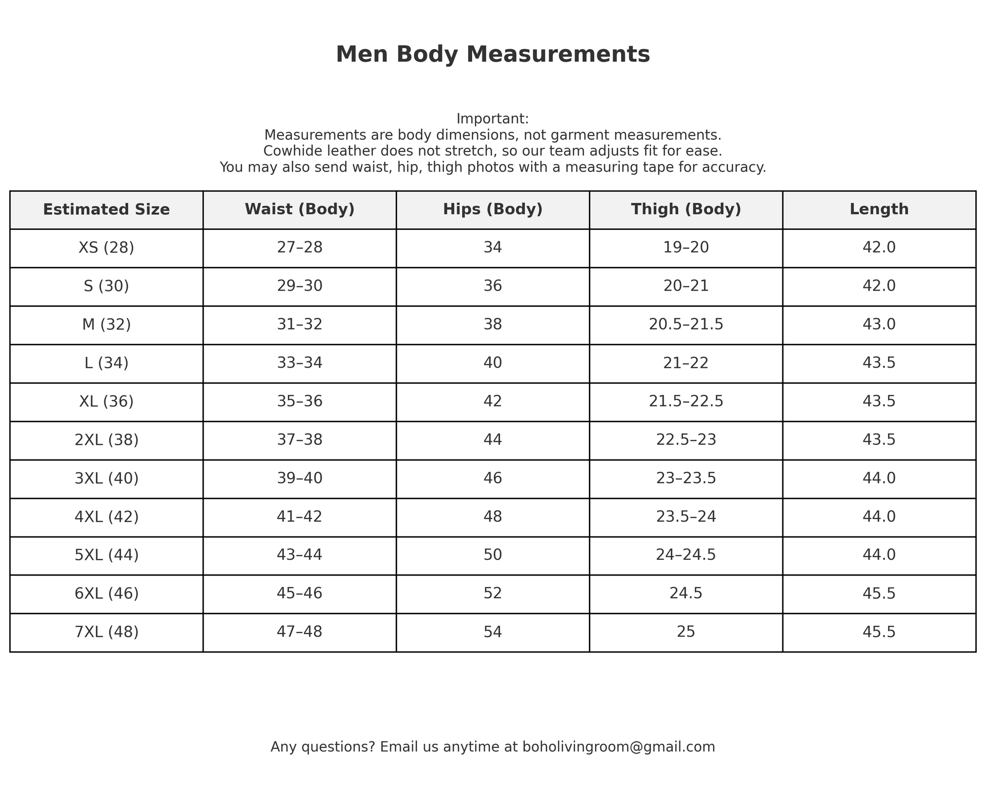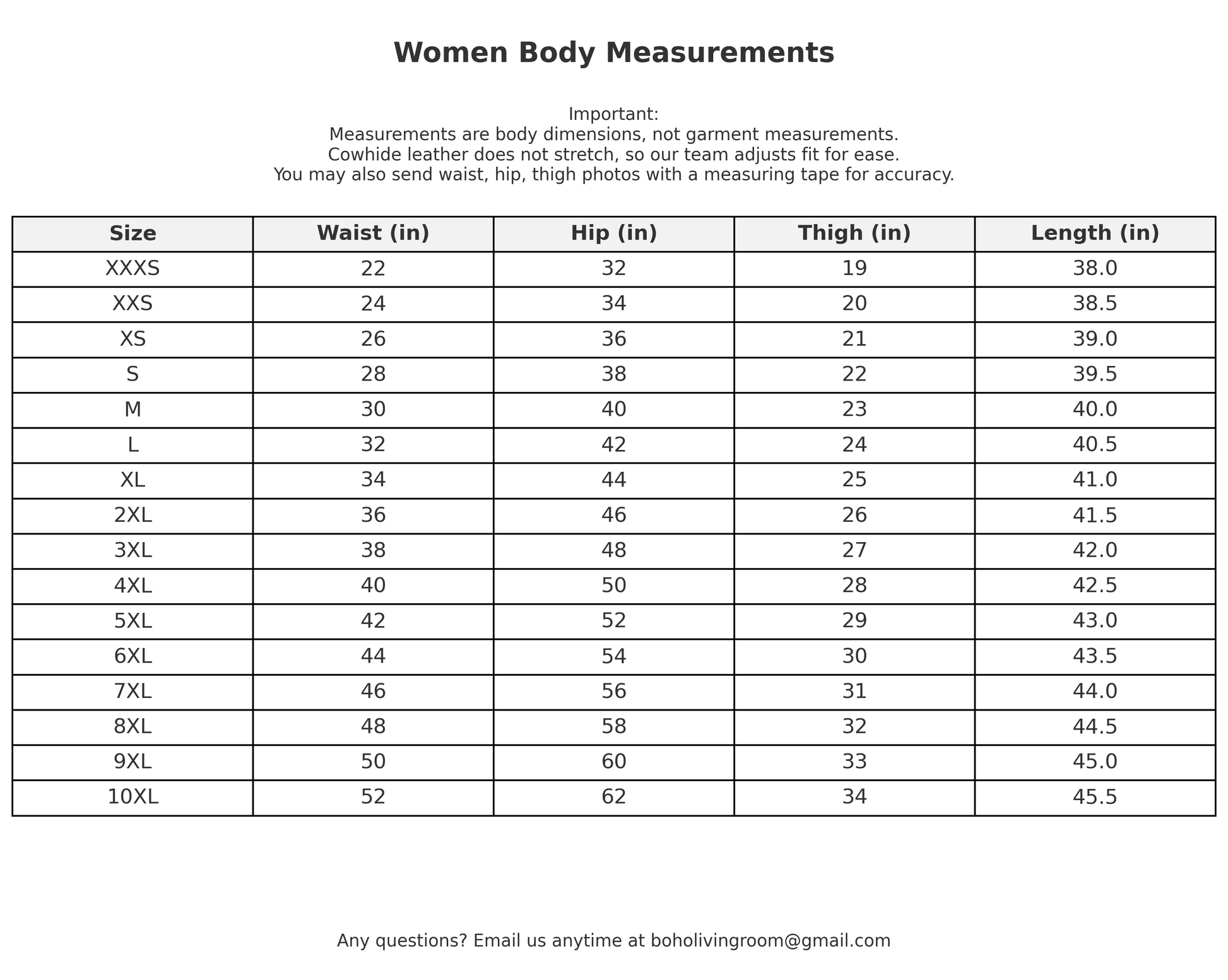 - If you can’t find your size in the chart, select custom and get tailor made cow hide pants