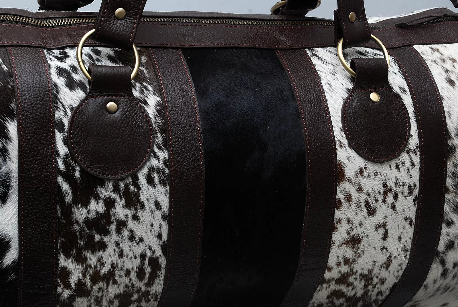 - Handcrafted from real cowhide with high-contrast black, white, and brown hair-on-hide panels – no two cowhide bags are the same
