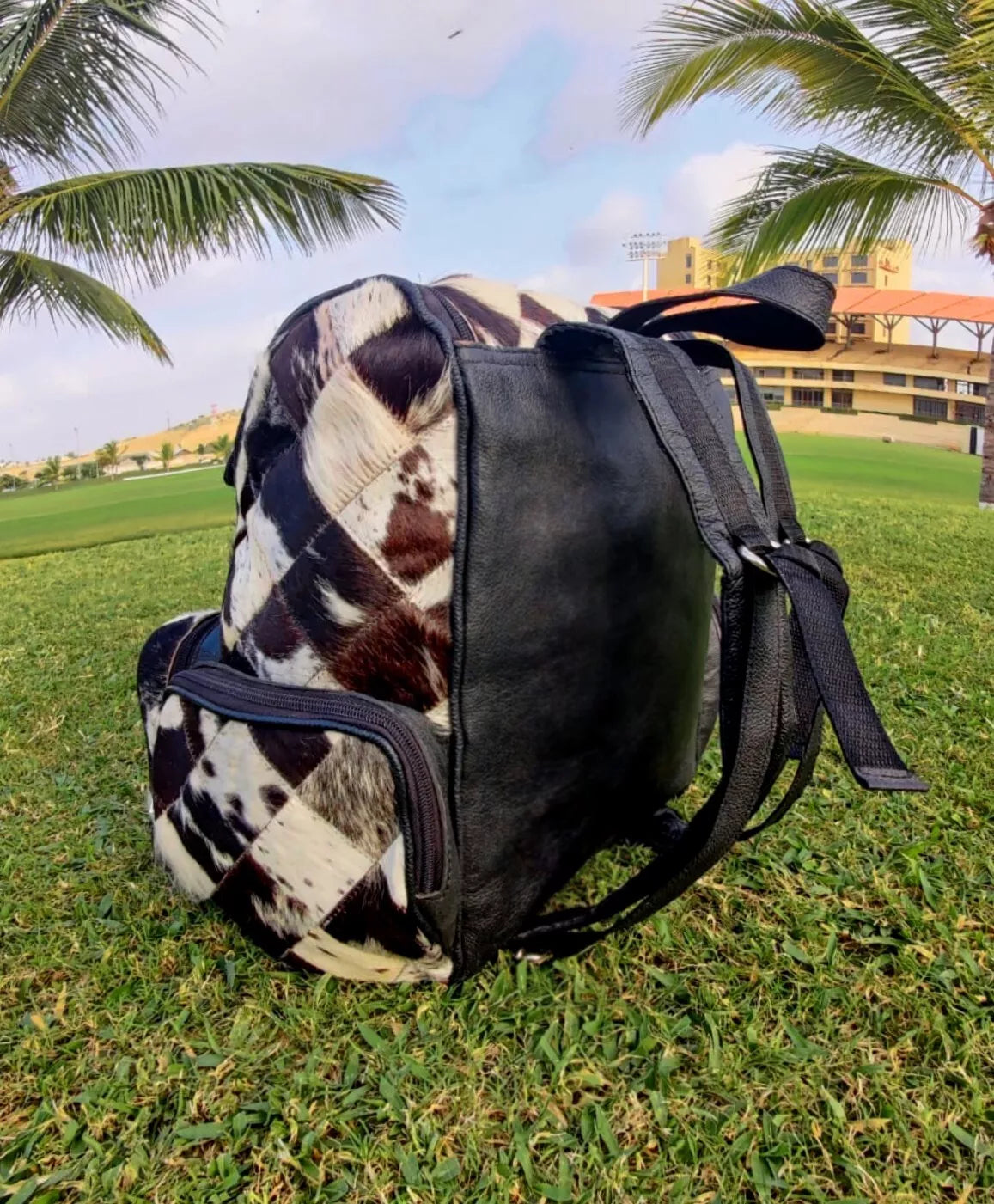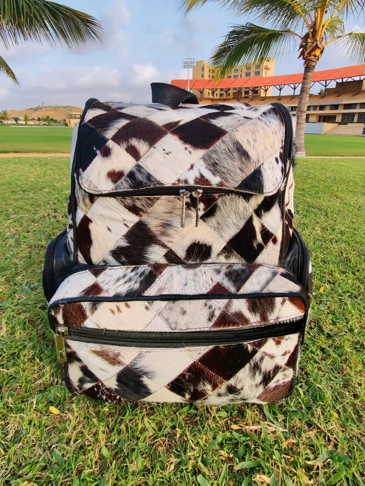 - Handmade from real cowhide with natural tricolor tones – every cowhide backpack carries a distinct, authentic pattern