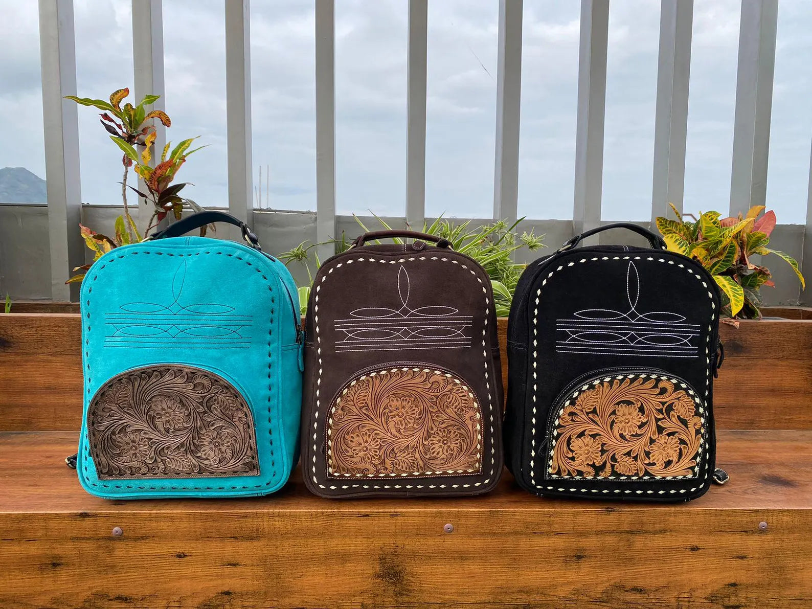 Each backpack in this collection features a rich suede texture complemented by intricate tooled leather panels. These panels highlight ornate floral designs, adding a classic Western aesthetic. Available in striking turquoise, deep brown, and black, these backpacks cater to varied preferences while maintaining a cohesive, elegant look.