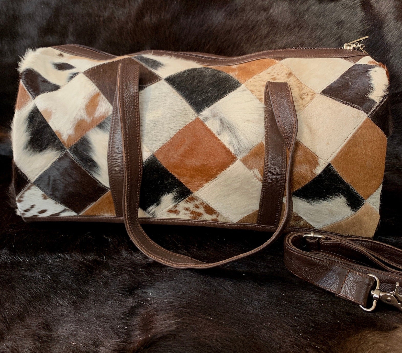 - The size of this cowhide duffle purse is 20" x 12" x 12"