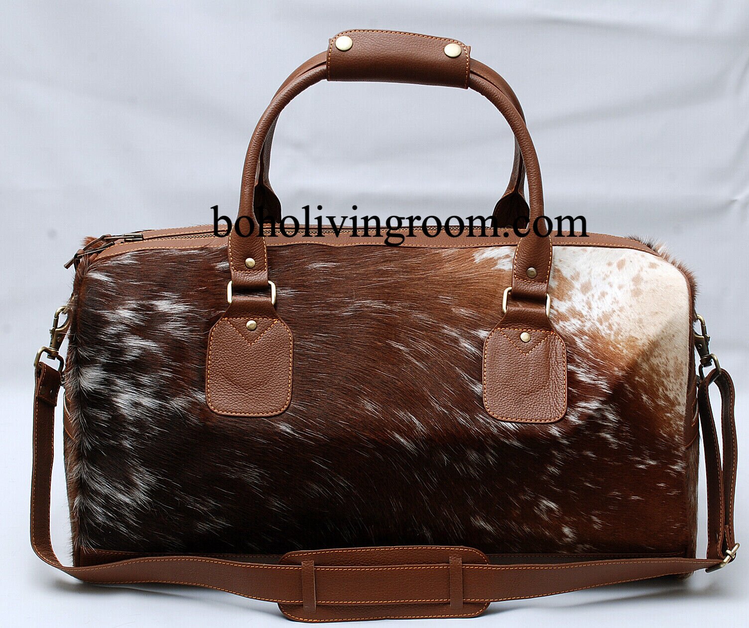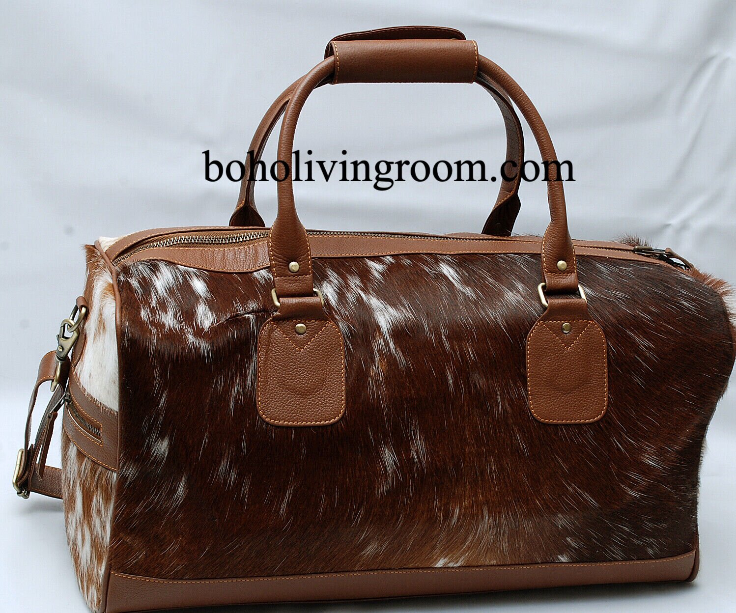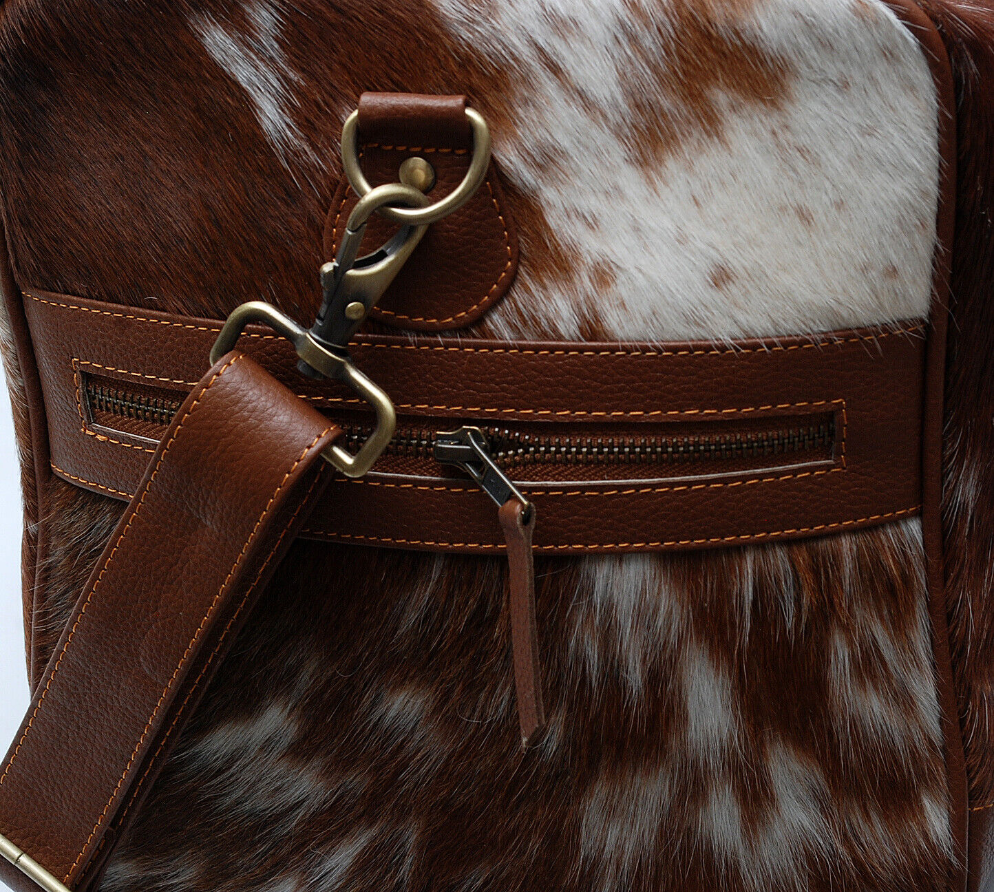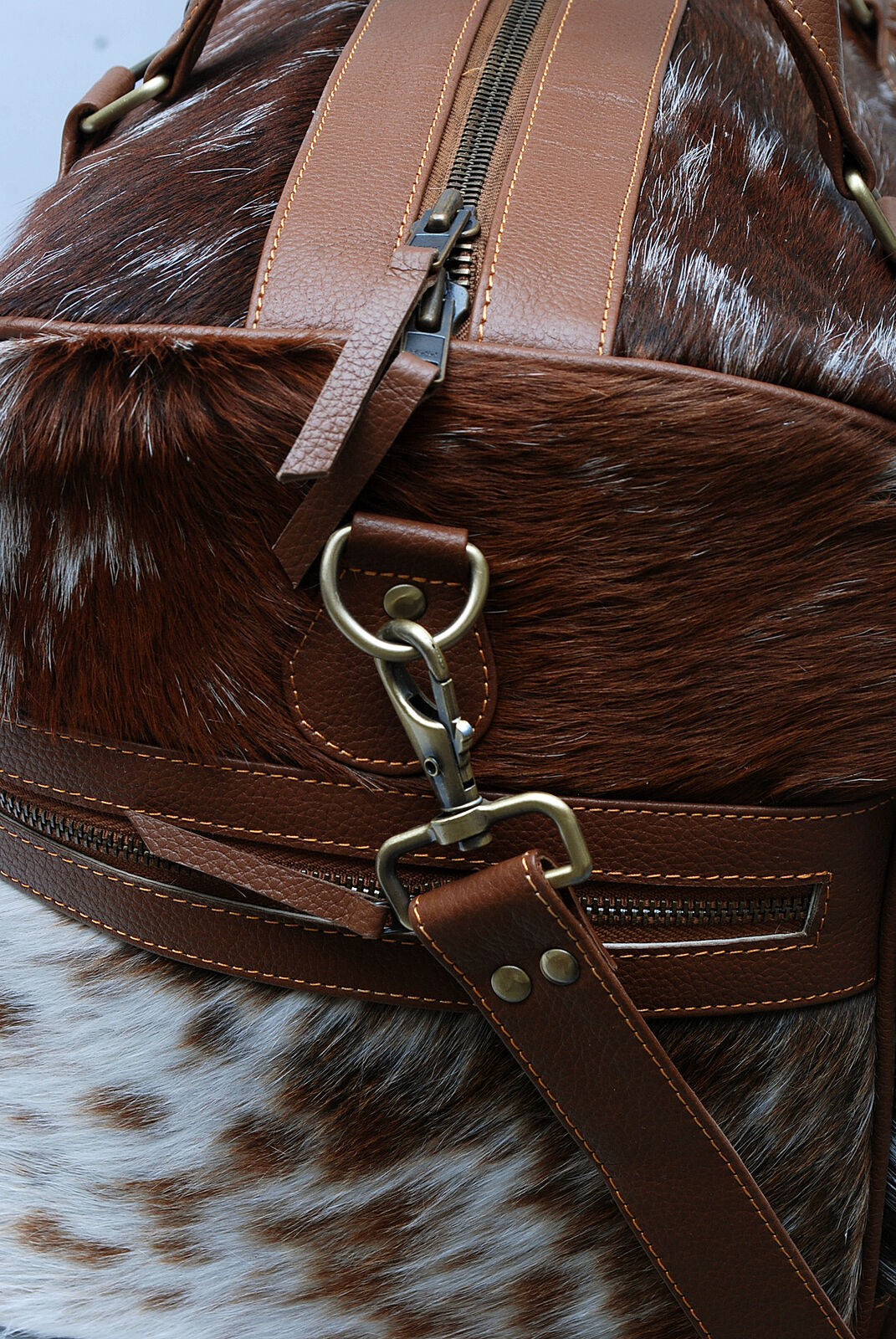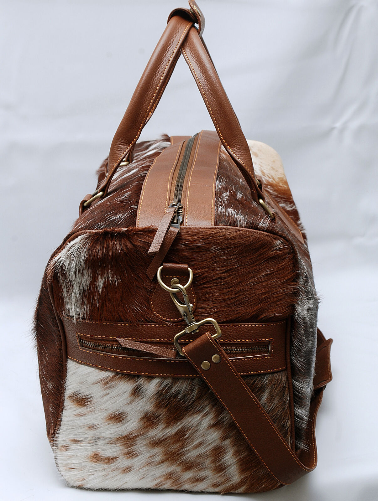When it comes to travel, having the right cowhide bag can make all the difference. And if you're looking for a high-quality, stylish option that's built to last, look no further than this stunning custom made weekender bag in natural cowhide. With its dark brown and black pattern, double stitched seams, thick stitching, and custom design, this cowhide travel bag is sure to turn heads wherever you go.