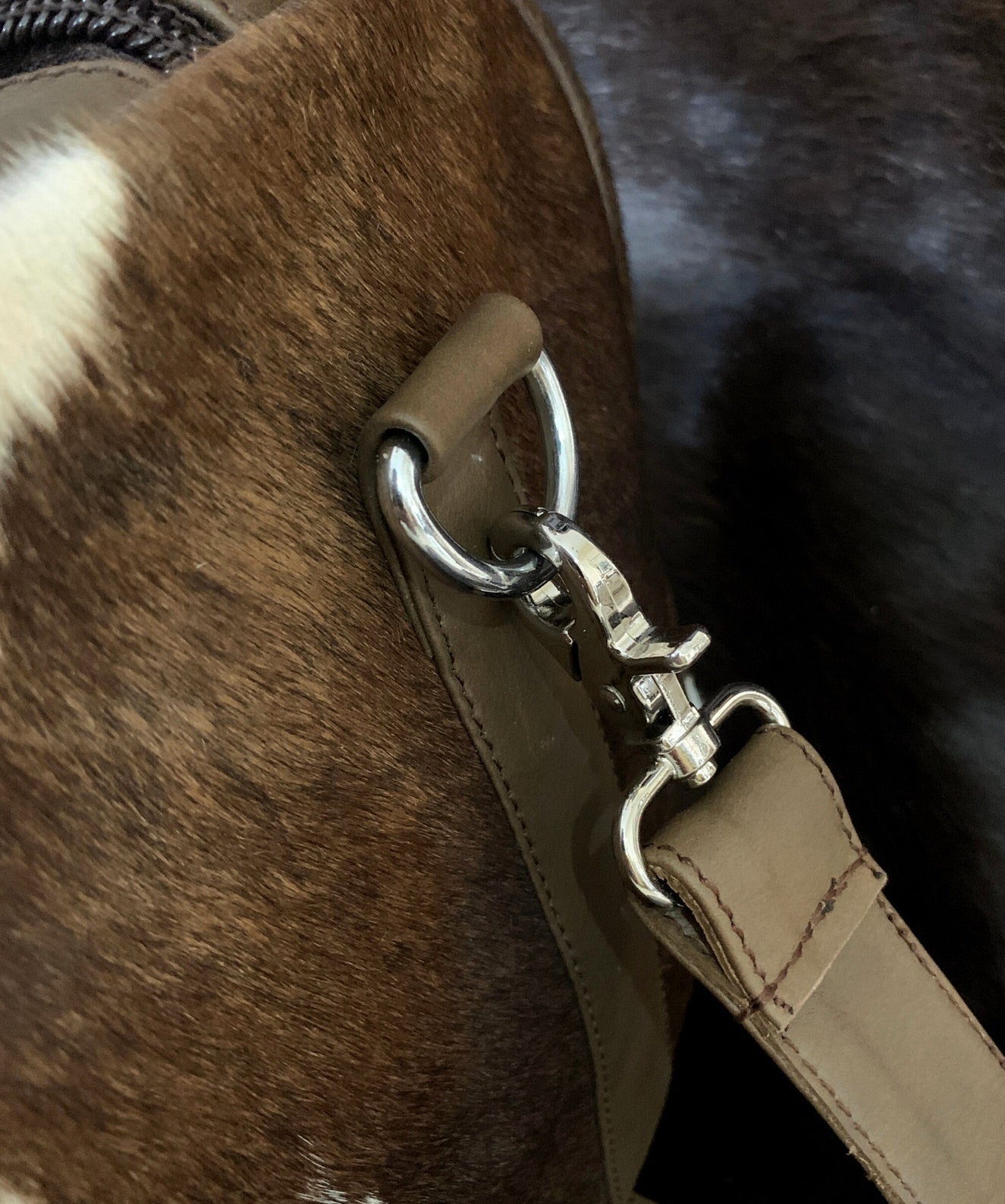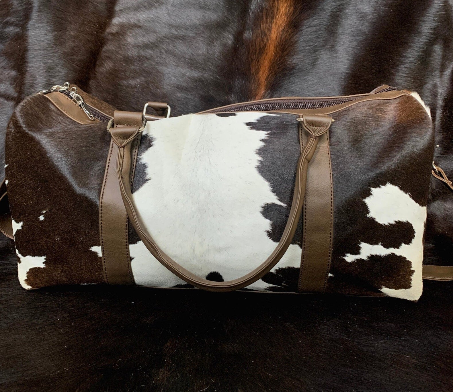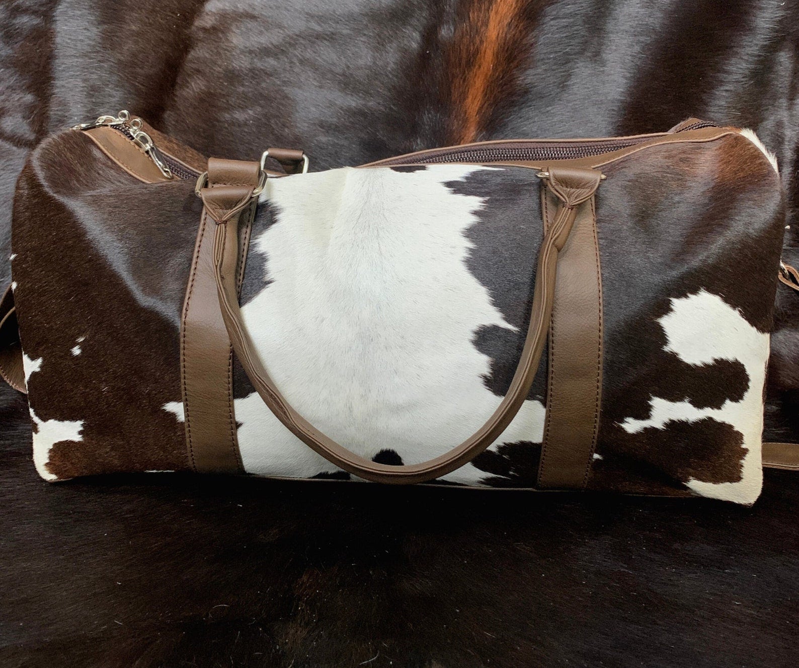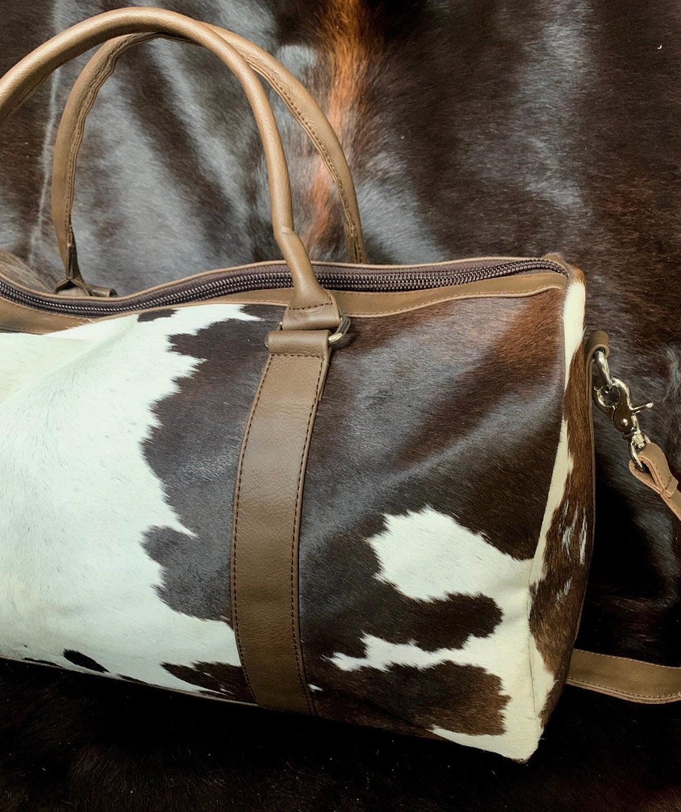 This luxe cowhide duffle bag makes a perfect weekender. Crafted from genuine leather and cowhide, it's stylish, spacious and tough enough for all your adventures.