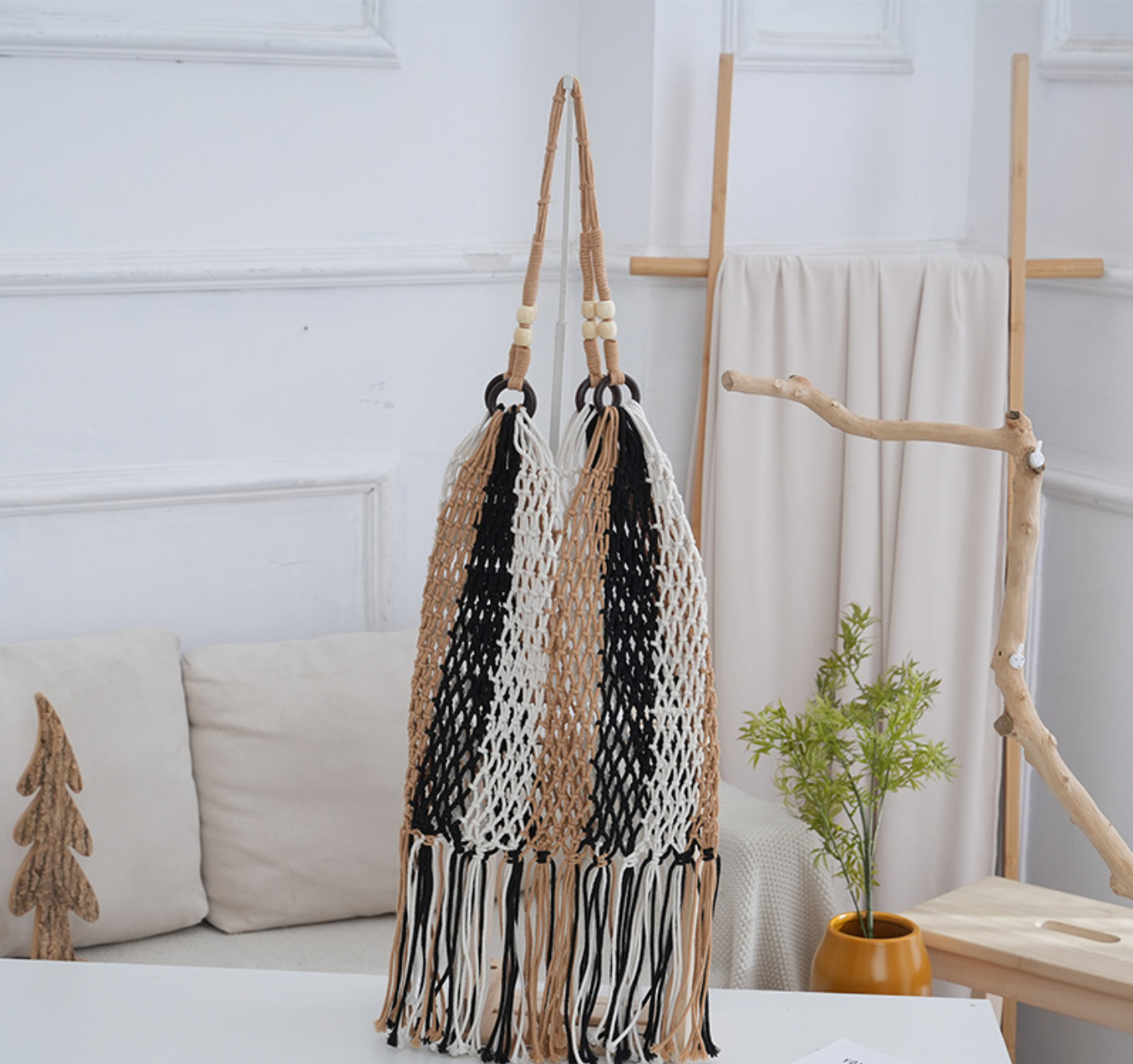 - Design Highlights: Hollow weave pattern, tassel accents, subtle plaid texture