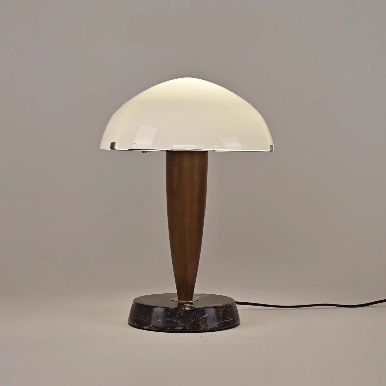 - Modern table lamp designed with walnut wood base, marble stand, and opal glass dome for warm ambient glow