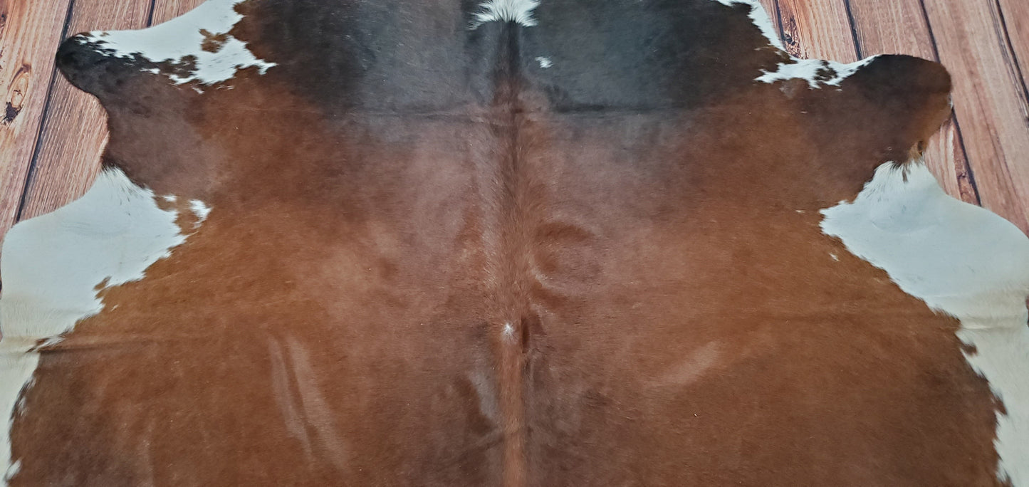 All my cowhide rugs are premium Brazilian, with beautiful shine and perfect thickness. We handpicked each for its exotic patterns and markings. Like all other cowhides this one is also unique and one of its kind, it's mostly dark brown, black and white with a beautiful tan in the background.