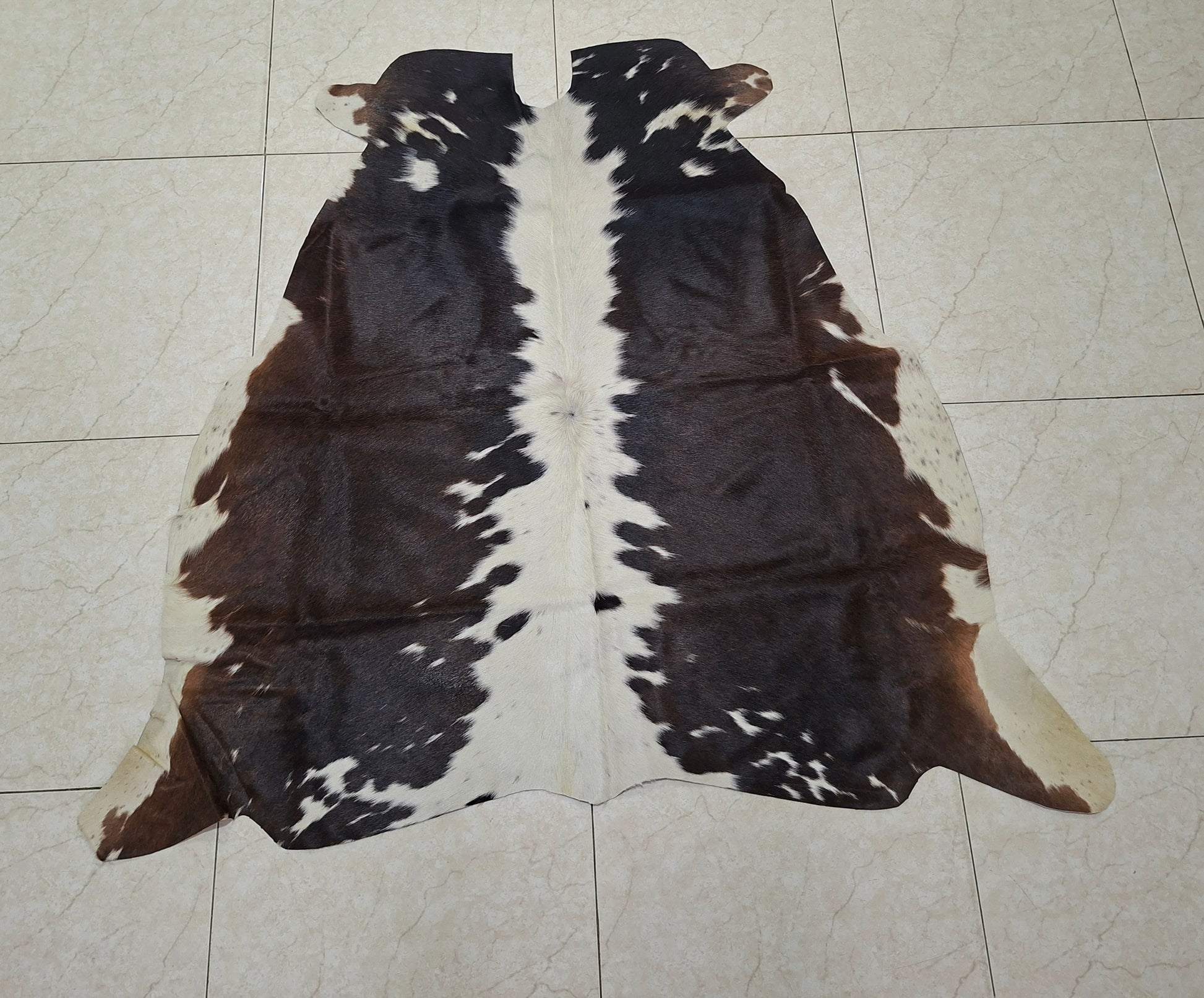 The natural tricolor pattern blends dark brown, soft black, and creamy white—ideal for rustic, modern, or farmhouse interiors. Use this small brown cowhide rug beneath a side table, at the foot of a reading chair, or placed diagonally in a hallway for visual interest. Unlike synthetic imitations, these cow skin rugs reflect the true irregularities and markings found only in authentic cow hide rugs, creating an earthy, grounded vibe.