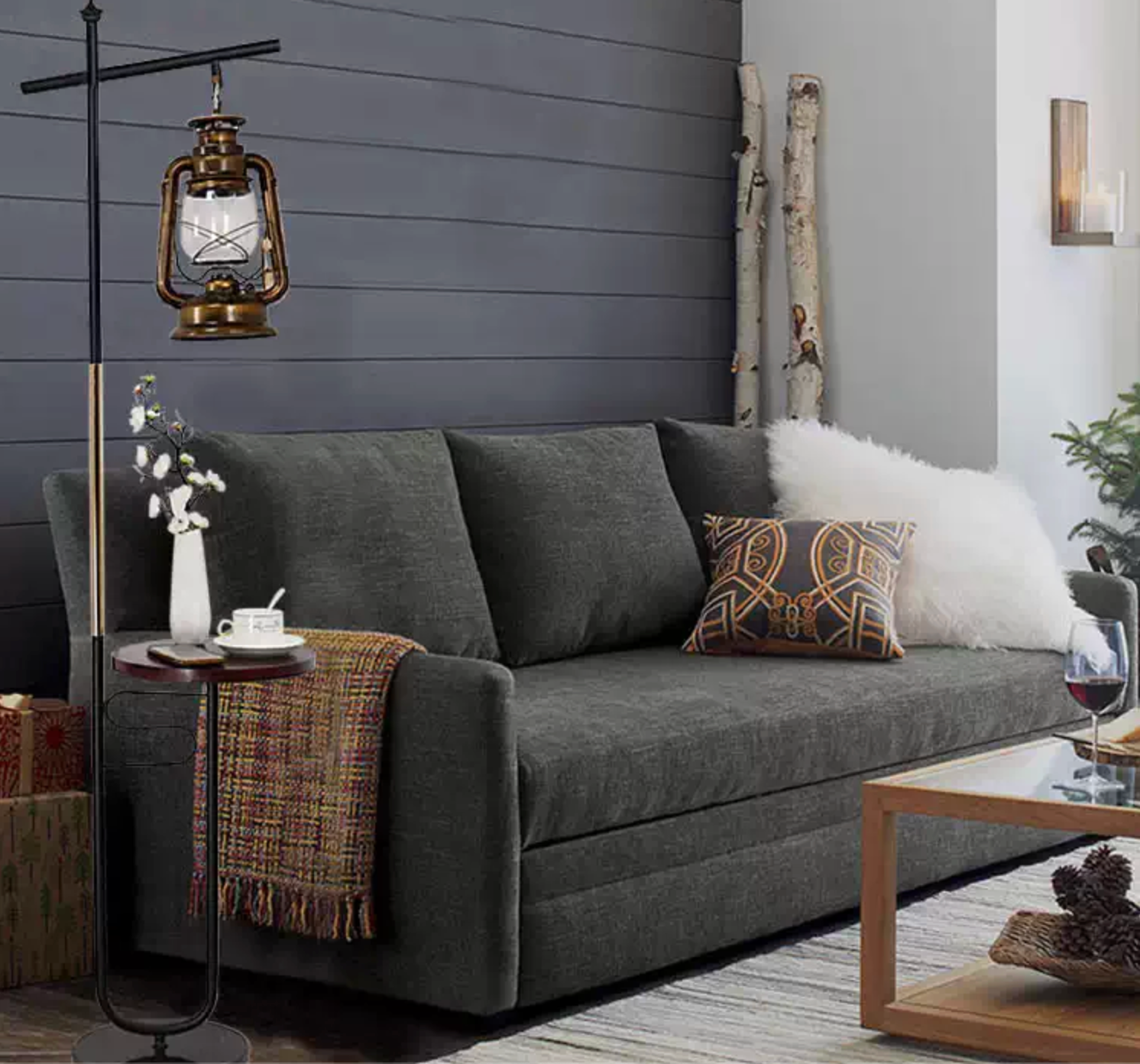 • Modern floor lamp design blended with industrial style iron frame and retro lantern detailing