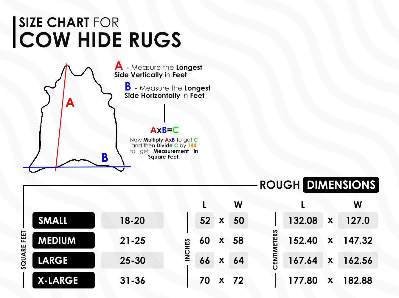 The size of these natural cowhide rugs are approx 5ft x 5ft and larger.