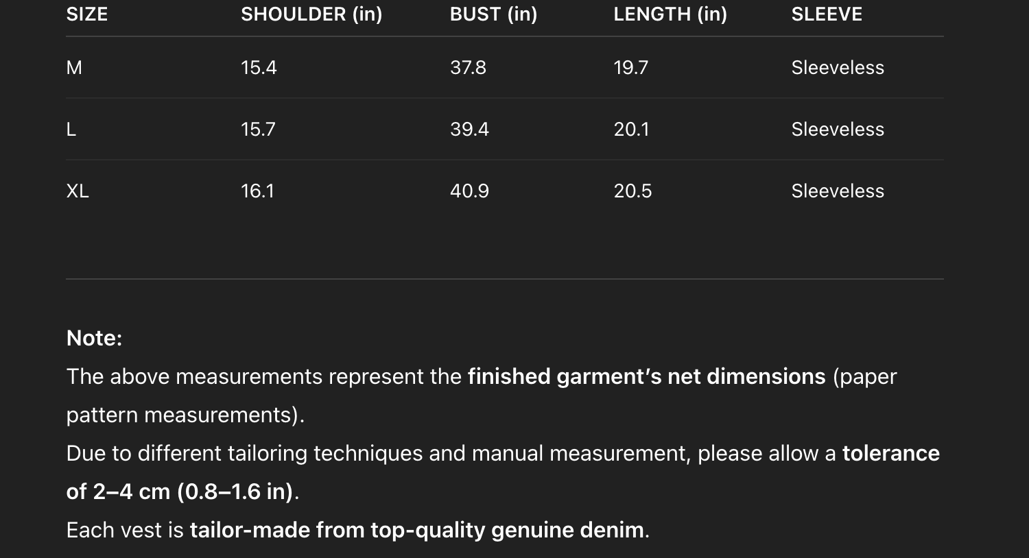 - It takes approximately seven business days to complete each denim vest.