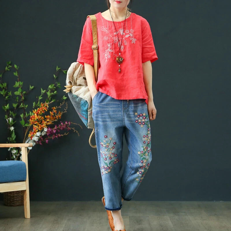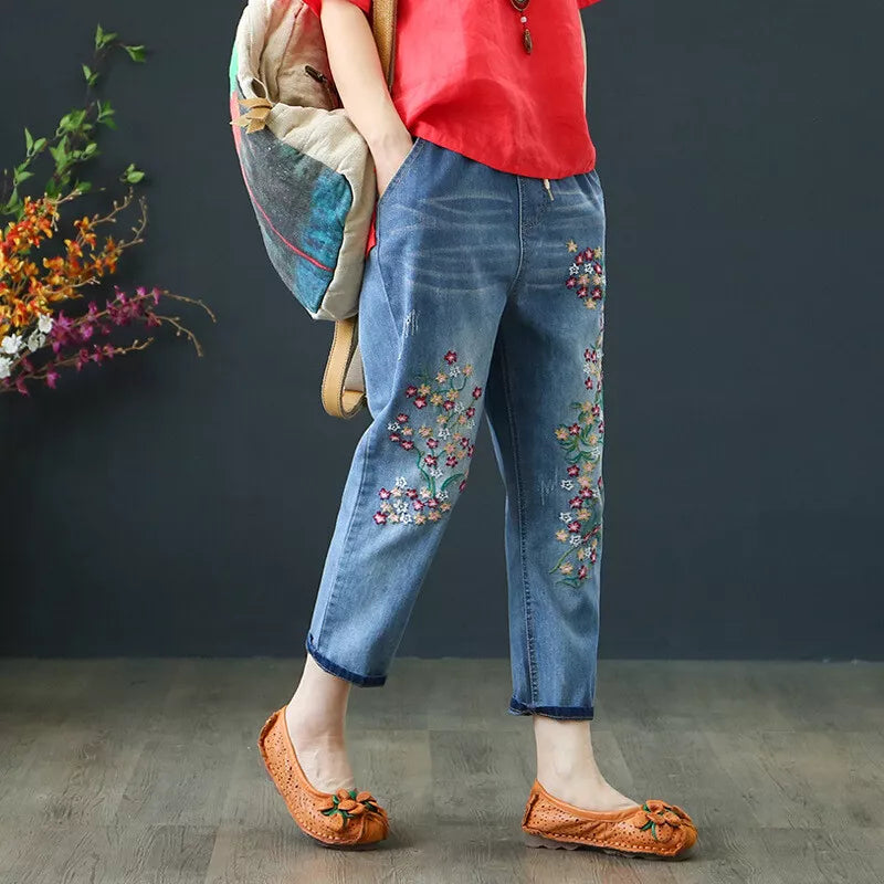- Floral embroidered jeans with colorful threadwork – adds detail across both legs for a standout boho look