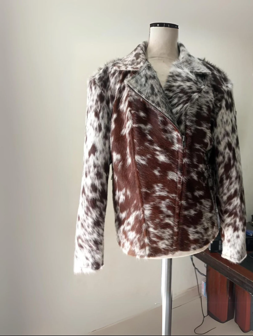 Turn heads in this women cowhide jacket, a bold mix of western flair and natural hide character. Made from real hair on cow hide, this tricolor cow skin jacket features an eye-catching cow print pattern blending deep brown, crisp white, and dark speckled tones — no two pieces are alike.