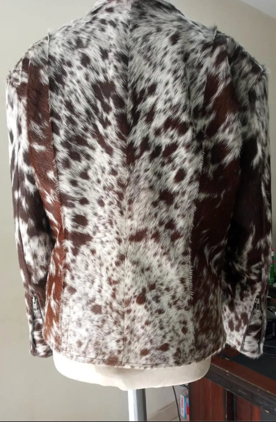 From the front, the asymmetric color placement draws attention with a darker chest panel, while the back features a striking symmetrical hide pattern. Full-length sleeves include subtle zippers for flexible styling. The tailored fit ensures this hair on cow hide jacket moves naturally with your body — great for events, outdoor gatherings, or casual wear.