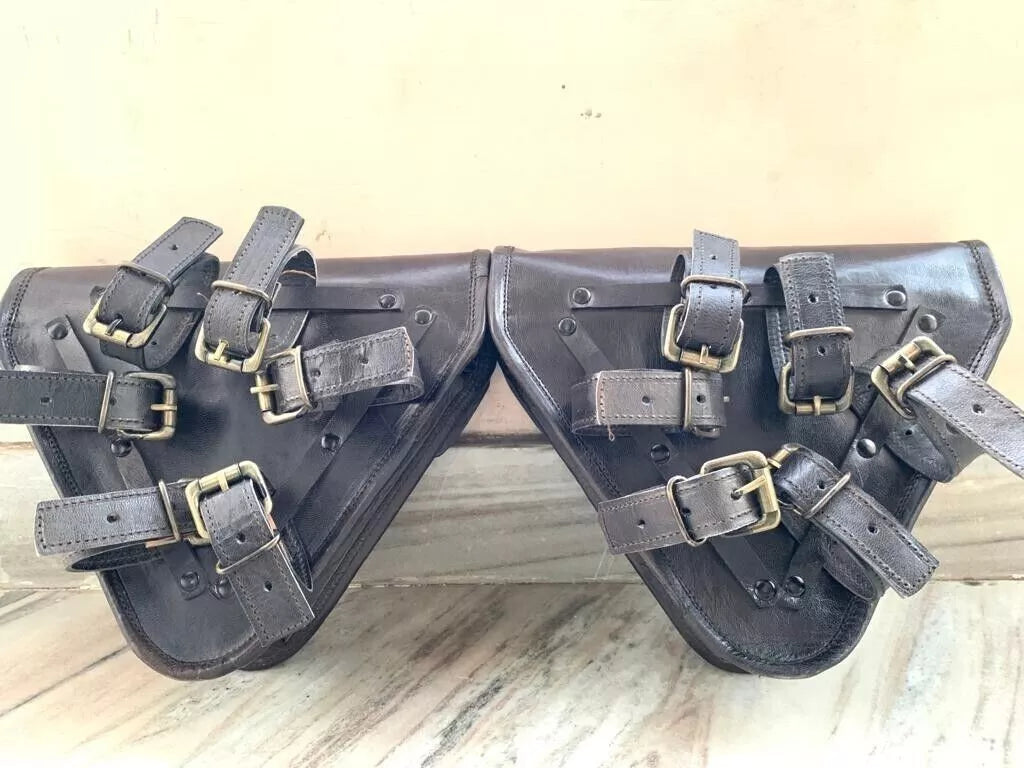 The leather pannier saddle bags in the images above are made from high-quality authentic leather, ensuring a classic look that complements any motorcycle or bicycle setup. The black finish, along with reinforced stitching, gives these motorcycle leather bags a rugged yet refined appearance. With brass-toned buckle closures, they not only offer a secure fit but also add a timeless, traditional touch to the overall design.