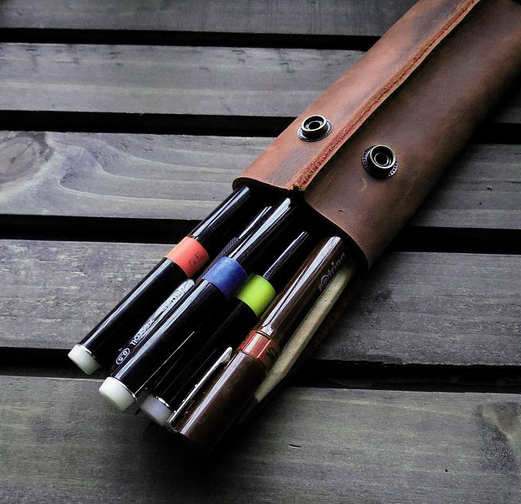 The design of the case is minimalist yet highly functional. It features a simple flap closure secured with two robust metal snaps that ensure your pens and pencils are safely contained while adding a touch of vintage flair. The stitching along the edges is executed with precision, showcasing the artisanal quality and attention to detail. The red thread used for the stitching provides a striking contrast against the dark leather, making it visually striking and easy to spot in a bag or on a desk.