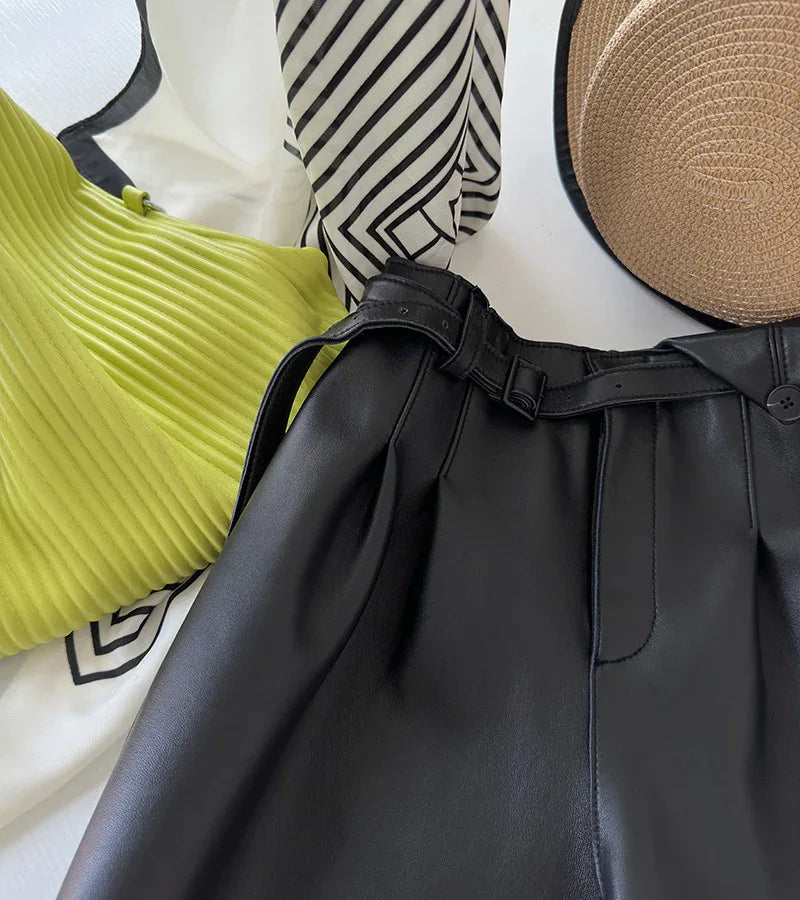 These women leather shorts are made from genuine sheepskin with a high waist, a-line shape, and wide-leg comfort. The belt adds an adjustable cinch and the elastic waist supports daily wear. Use leather high waisted shorts as an easy base with knits or tees, and keep leather shorts women as a go-to option for clean outfits.