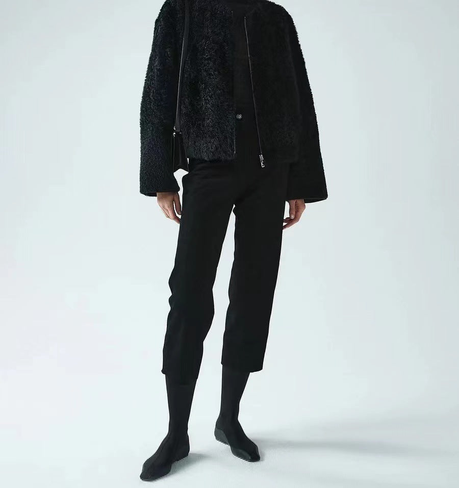 These genuine suede pants for women are tailored from premium goat leather suede, delivering breathable comfort with a naturally soft touch. Featuring a high waist leather trousers fit, the design flatters the waistline while offering secure, all-day wear. The black suede women pants style with nine-point cropped length creates a refined silhouette that works effortlessly with sweaters, coats, and ankle boots. Lightweight yet structured, they adapt seamlessly from casual to evening occasions. A must-have wardrobe essential, these suede pants combine minimalist aesthetics with long-lasting wear, ranking as one of the most in-demand suede pants this season.