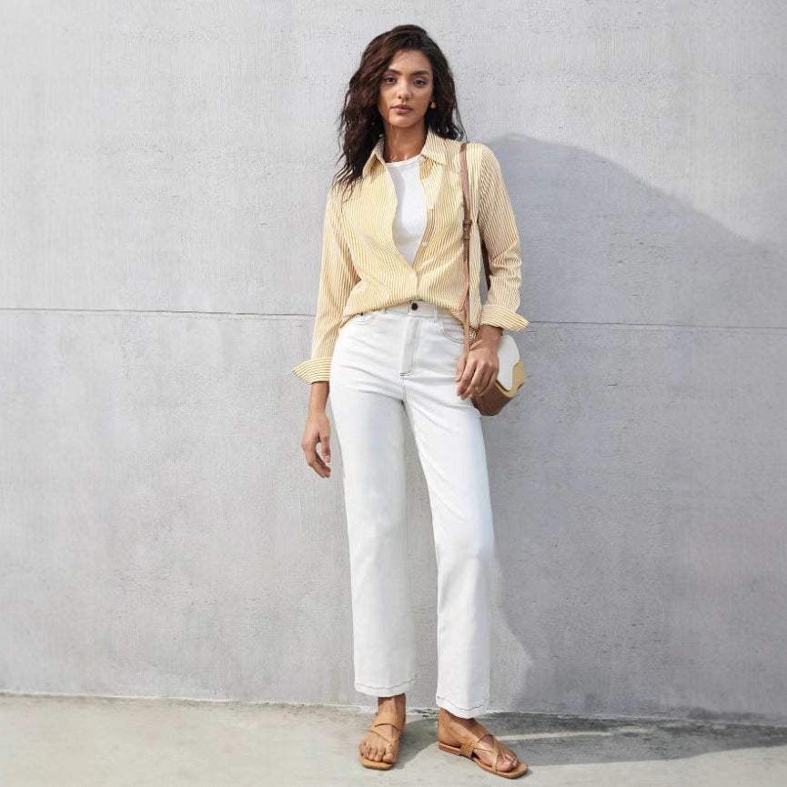 The casual long sleeve women's shirt showcases its adaptability and comfort. This cotton shirt's soft, breathable fabric makes it perfect for all-day wear. The shirt is styled with white shorts for a relaxed and effortless look, ideal for warmer days or casual outings. Meanwhile, its compatibility with denim, offering a classic and timeless appeal. With its non-stretch, durable material, this shirt ensures a comfortable fit that retains its shape and form after multiple wears.