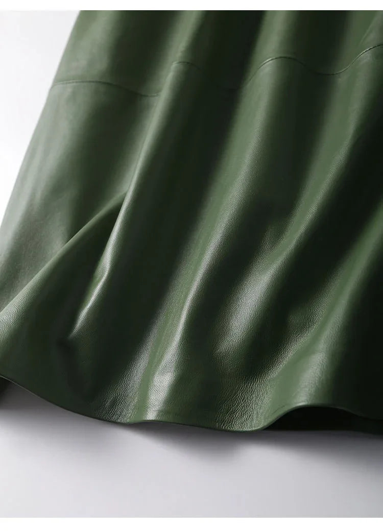 Premium green lambskin gives this high-waisted a-line midi a clean silhouette with double pockets and a slimming fit. made for a women's leather skirt wardrobe, it works as one of our leather midi skirts for women and long leather skirts for women without extra bulk. we carry the style in real leather skirts for women seeking soft lambskin and a secure waist.