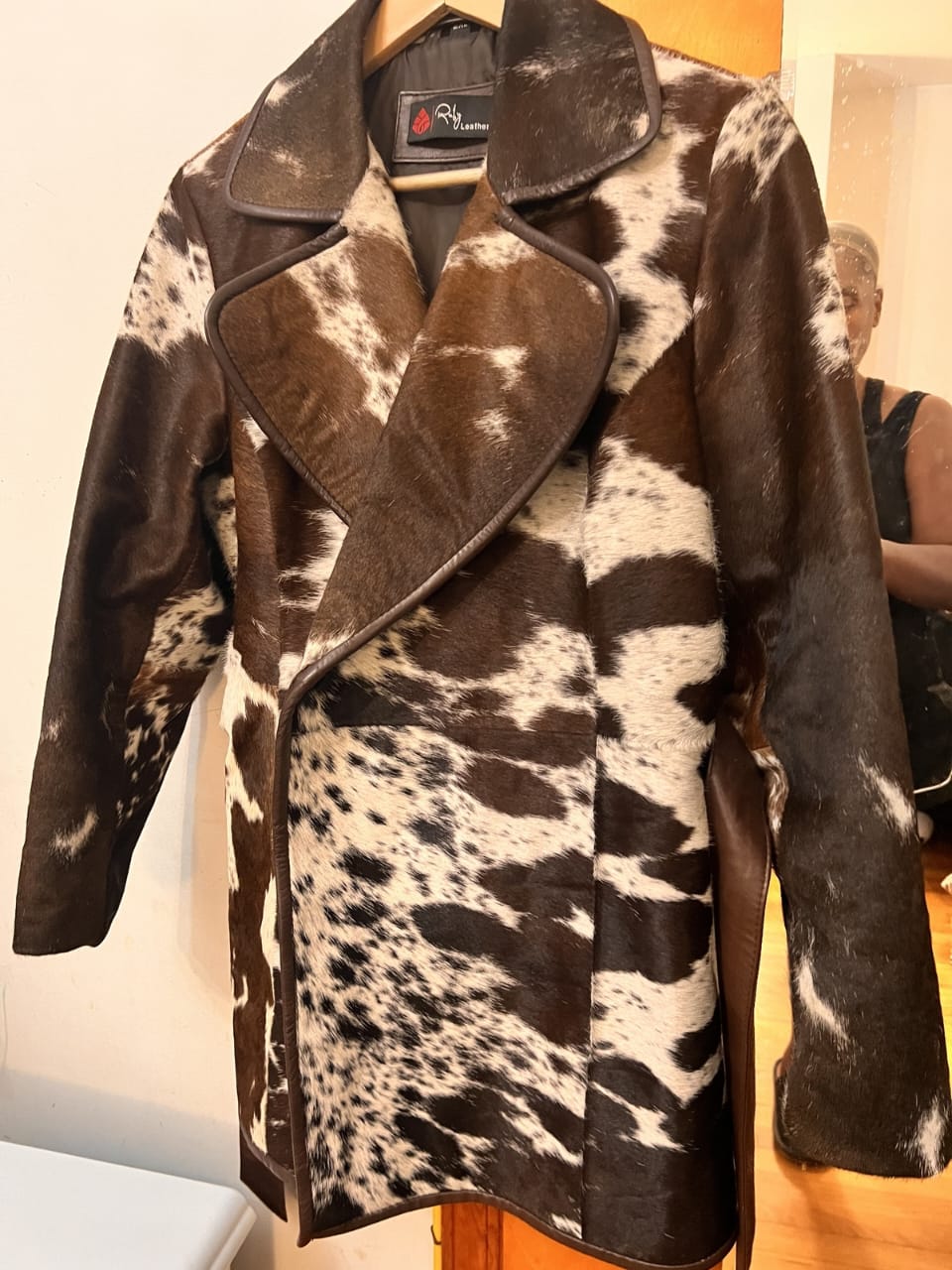- You will receive a hair-on cowhide trench coat similar to the one pictured.