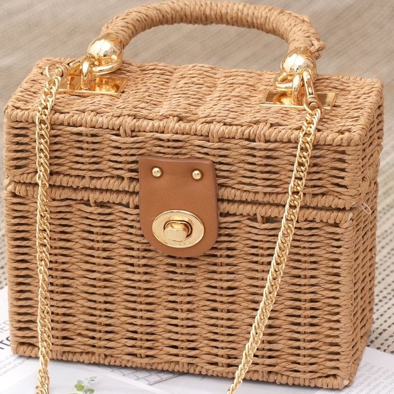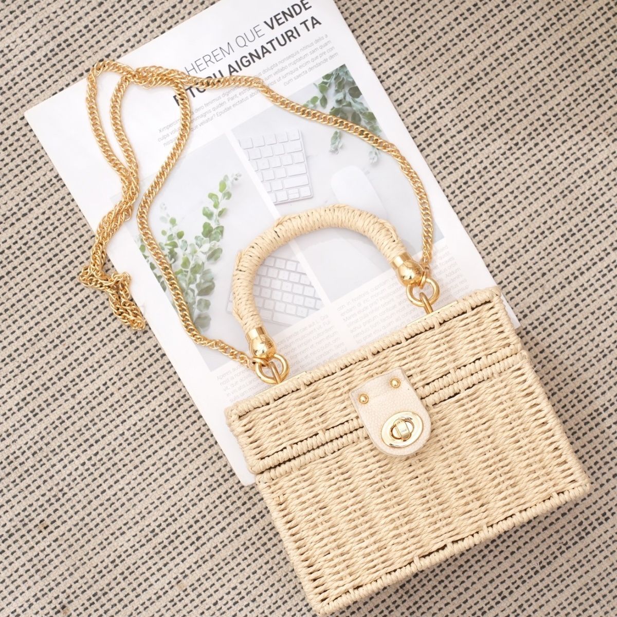 Elevate your summer look with this hand-woven rattan crossbody box bag, designed for women who want both style and function in a compact size. Featuring a sturdy gold-tone lock, detachable chain shoulder strap, and a structured rectangular silhouette, it works perfectly as a straw purse for summer, a woven handbag for daily carry, or a French-inspired cosmetic bag. With a lined interior that fits essentials like phone, wallet, and makeup, this women’s crossbody bag is versatile for travel, brunch, or city outings. Crafted with care, it blends timeless rattan weaving with modern gold details for a refined finish.