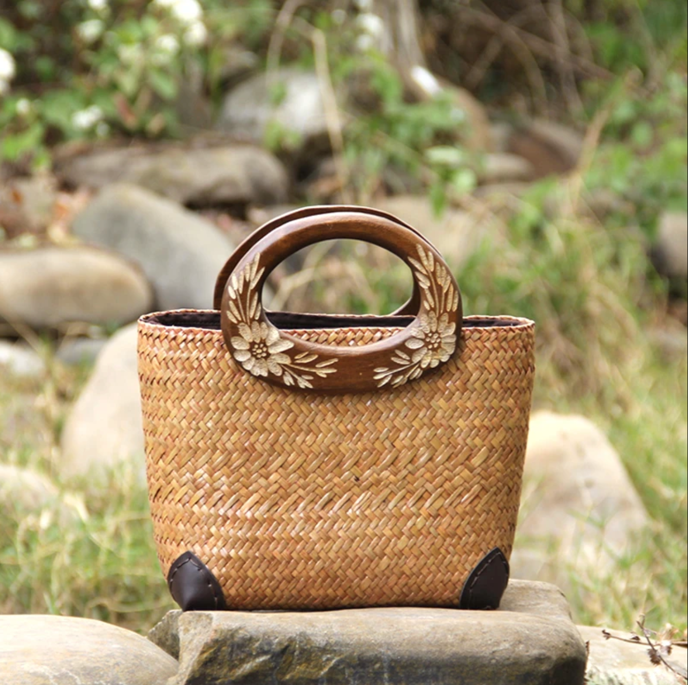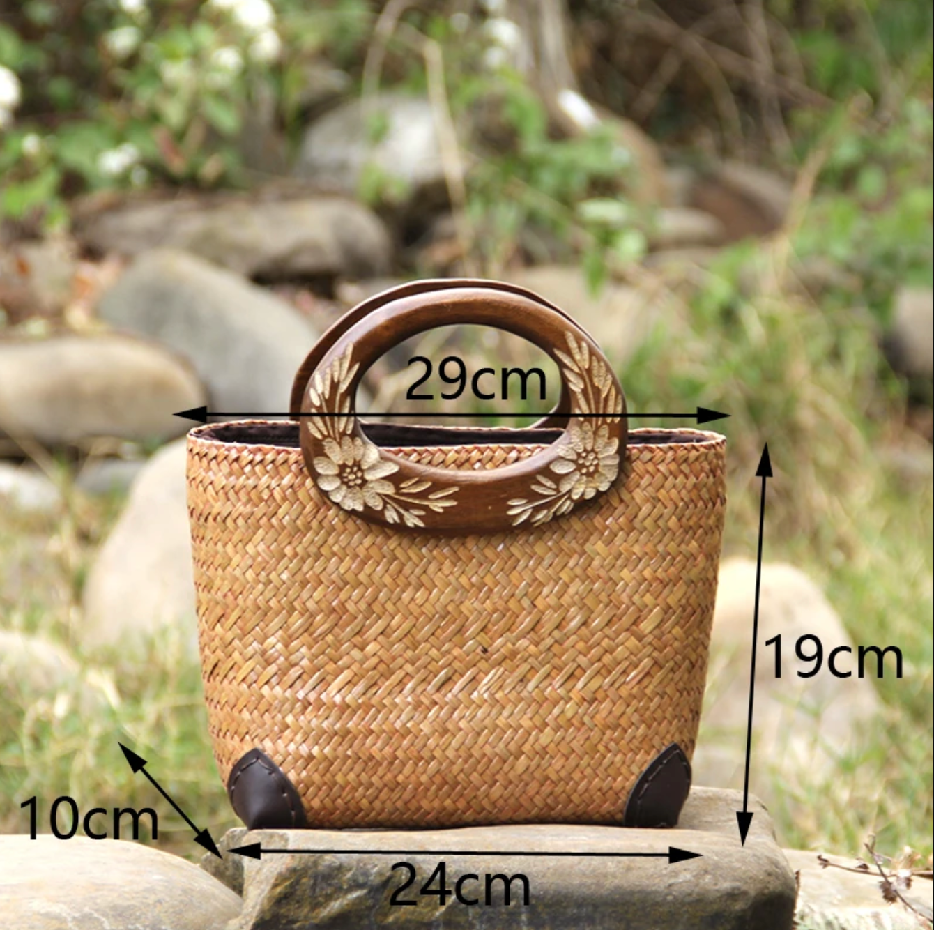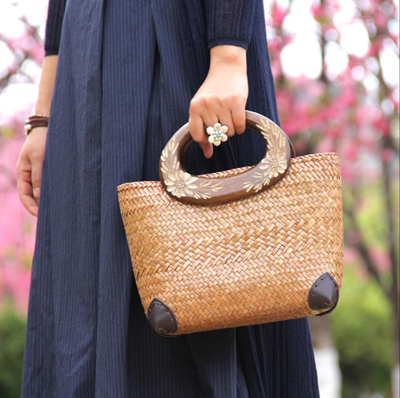 - Handwoven straw beach bag with floral wood handles for a natural summer look