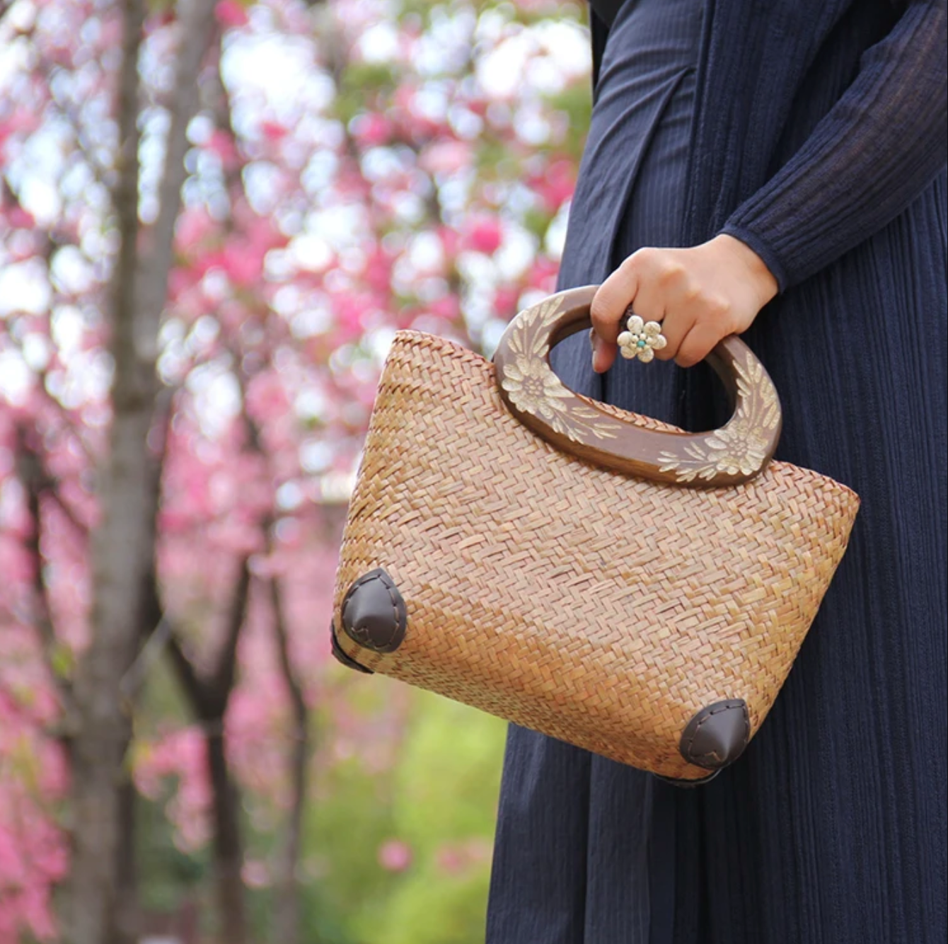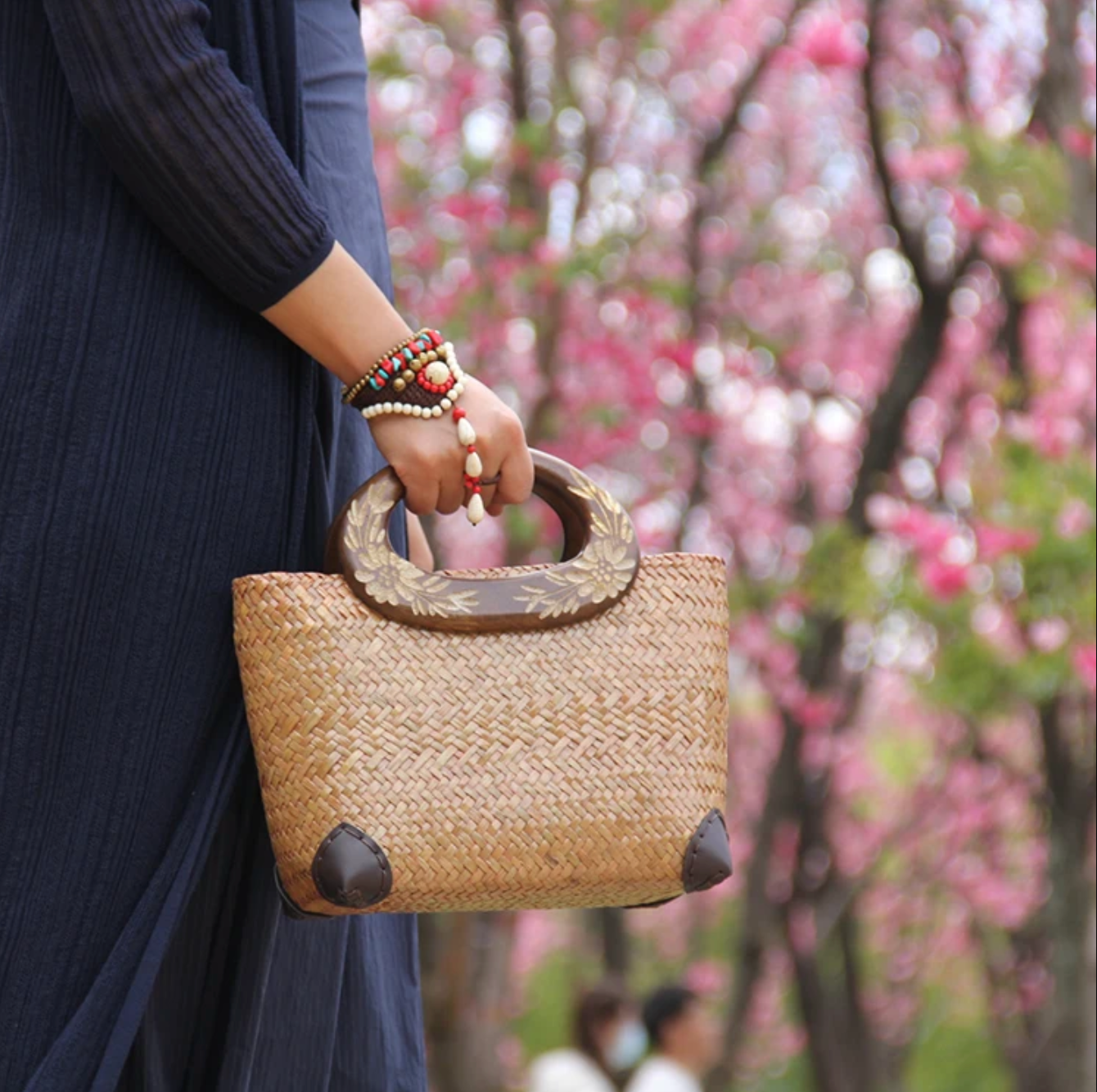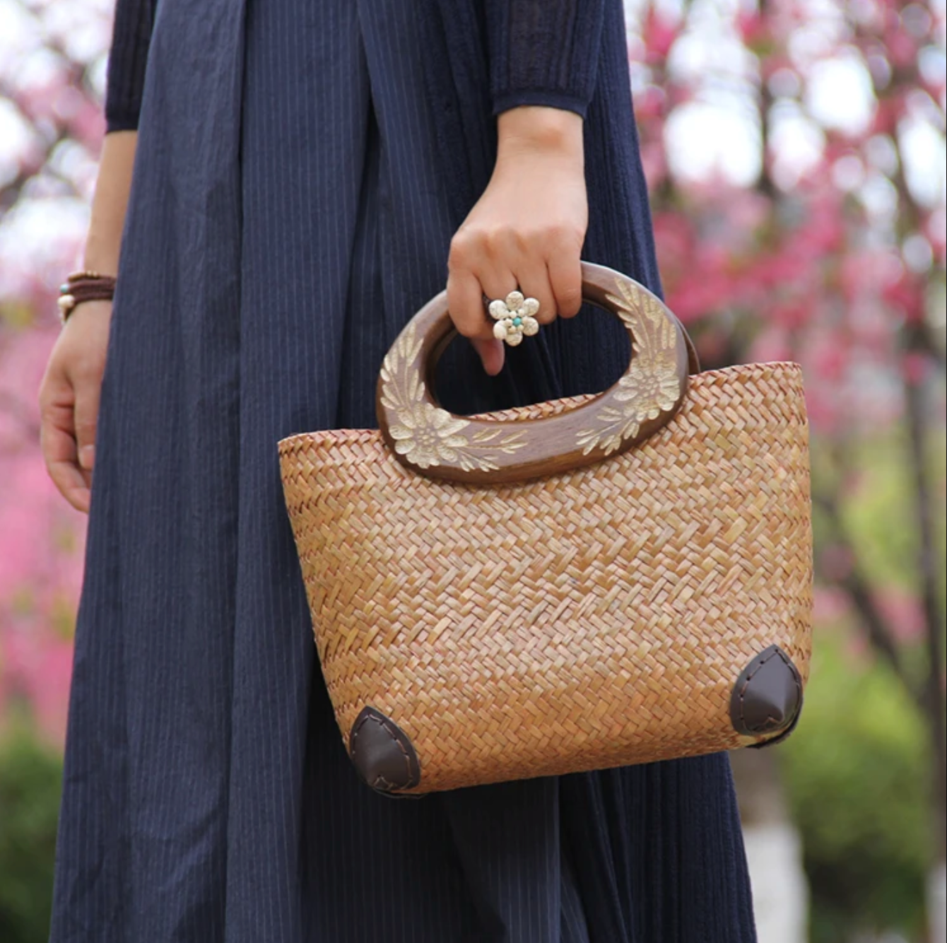 - Handwoven straw beach bag with floral wood handles for a natural summer look
