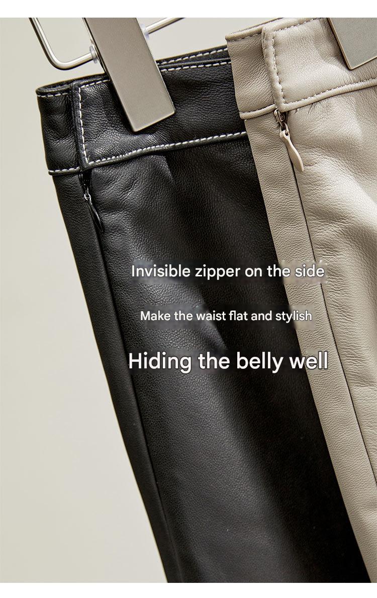 - High-rise leather waistband with invisible side zipper for a clean, belly-smoothing finish.