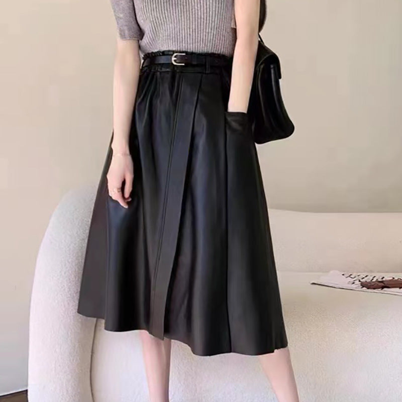 High Waist Black Leather Midi Skirt with Belt Pleated Design