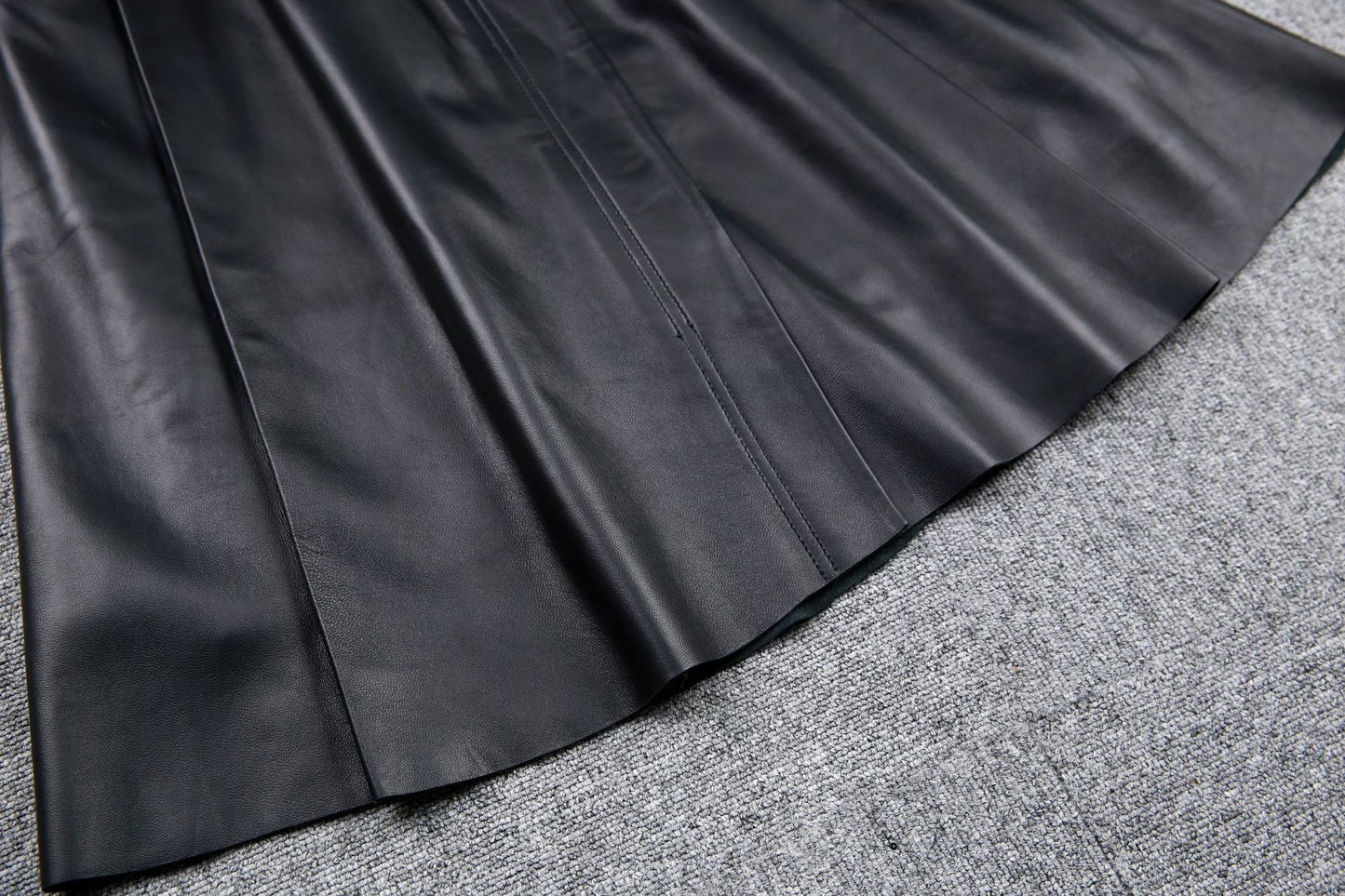 Women’s Genuine Sheepskin Pleated Leather Midi Skirt with Belt