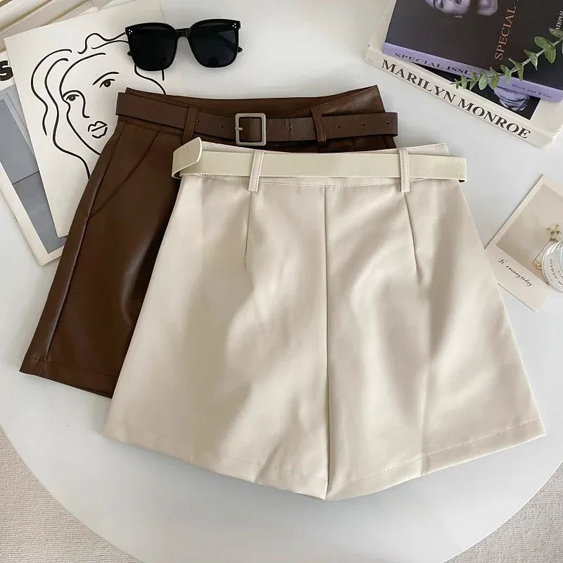 These faux leather shorts feature a high-waist shape with front pleats and a matching belt for a defined fit. Designed as leather short shorts for outerwear use, they balance structure with comfort. The smooth imitation leather shorts finish pairs easily with tops and boots, while the tailored cut supports a clean waistline and everyday wear.