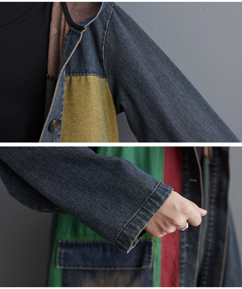 This hooded oversized denim trench coat for women combines classic silhouette with a statement twist. Designed with multicolor patchwork panels and a relaxed longline cut, this piece captures the aesthetic of a true oversized denim jacket while functioning as a full-length outer layer. The denim trench coat features a single-breasted front, large square pockets, and a uniquely paneled hood lined in brown, green, and red for added warmth and contrast.