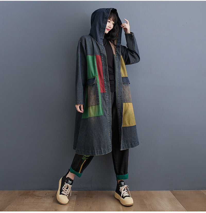 Patchwork Hooded Oversized Denim Trench Coat for Women