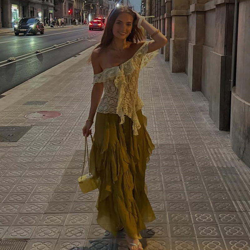 This lace-up one shoulder top for women combines asymmetrical ruffle design with breathable lace texture to create a standout summer silhouette. The lace ruffle ribbon summer blouse offers adjustable front ties and a semi-sheer body that complements both skirts and tailored pants. Perfect for travel, seaside dinners, or evening events, this lace blouse enhances natural shape while maintaining lightweight comfort.