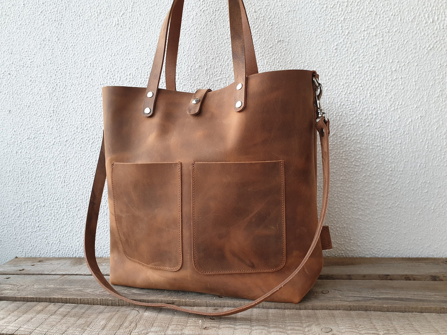 - Large brown leather tote bag for women made of strong pull-up leather!
