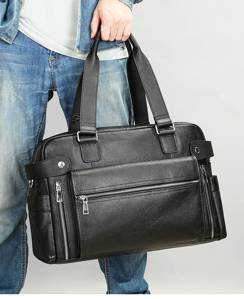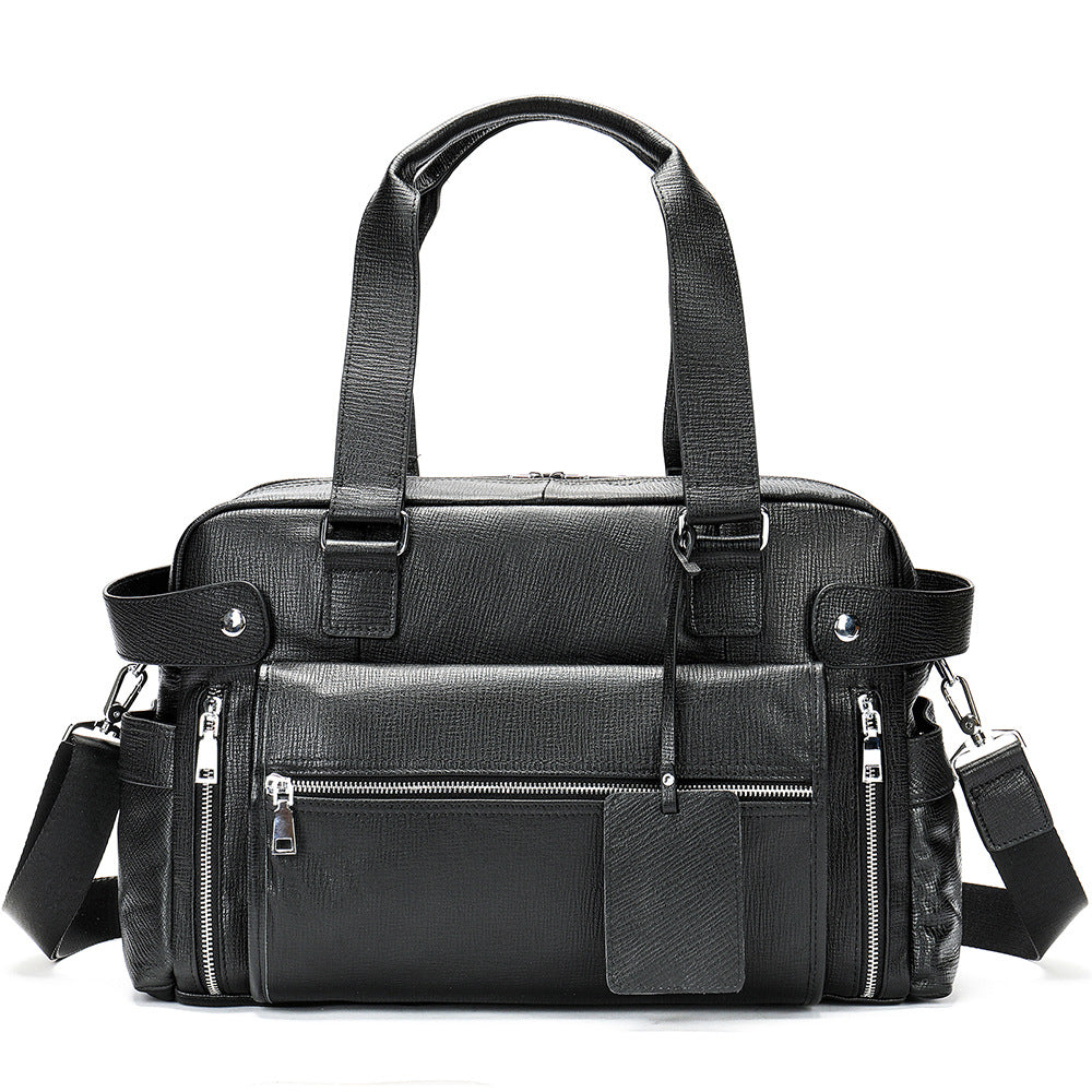 • Classic black finish with visible pebbled leather texture and minimal hardware for understated premium appearance