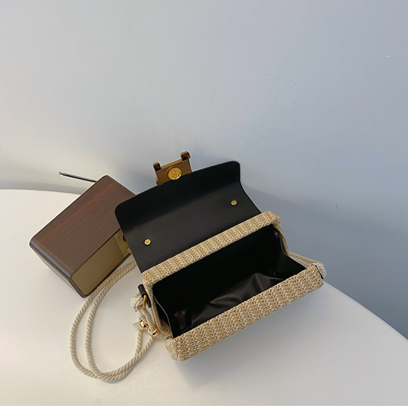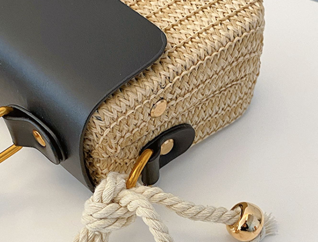 - Black straw handbags with secure flap closure to keep your essentials safe while on the go.